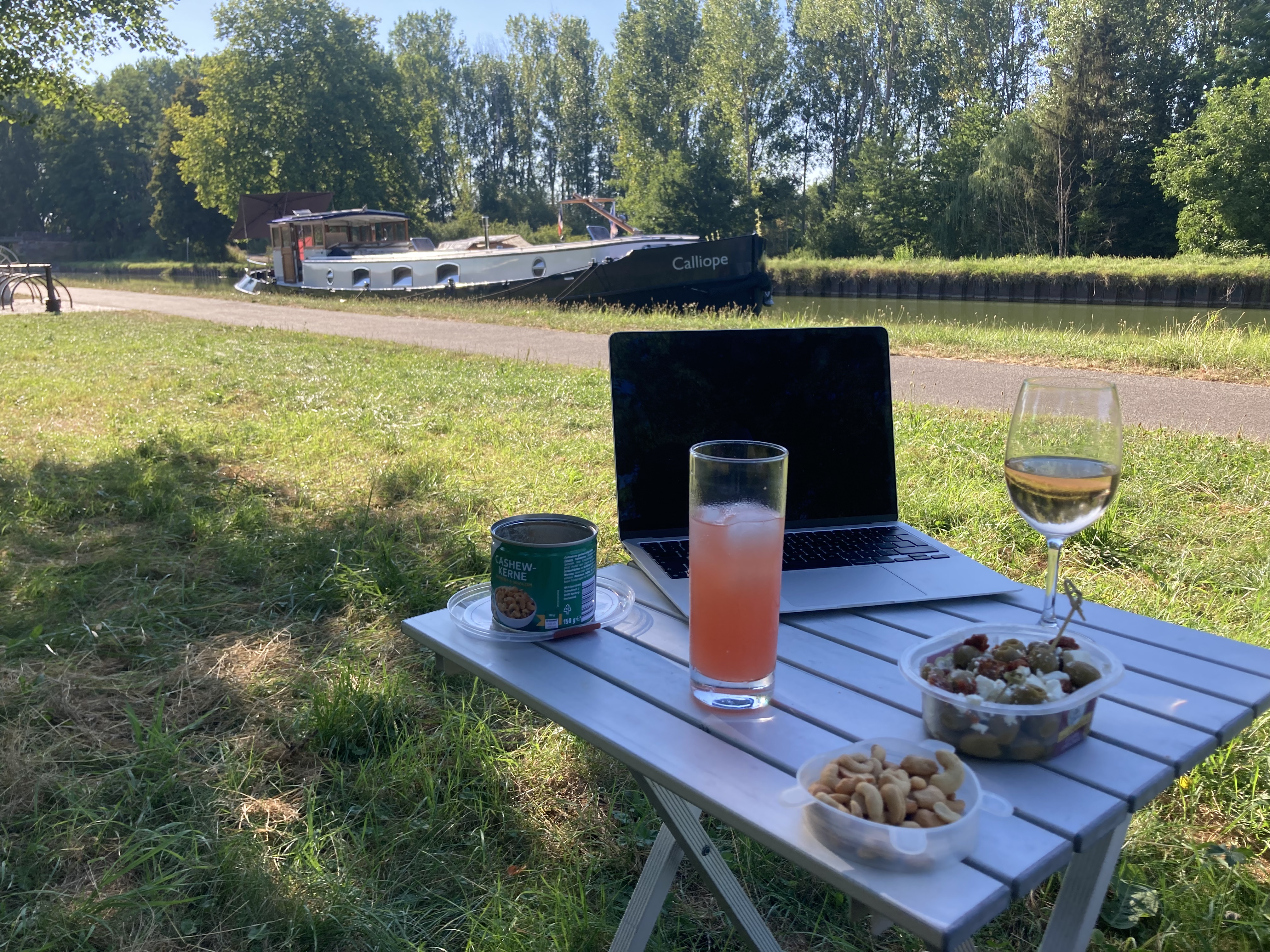 Supper was preceded by long drinks in the shade of the bankside trees; the river Zorn, a short walk away, was a cooling place to paddle and sit in the shallows; hair was tied up any-old-how off my neck; and the Red Ensign jooined forcwes with the parasol to keep the sun from the back deck.