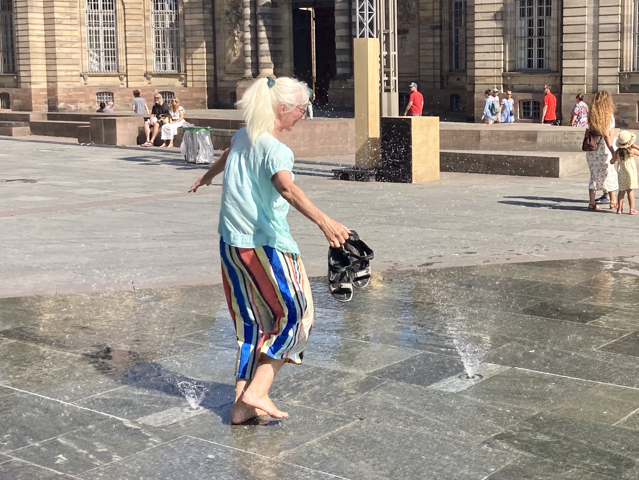 It was still hot, the heatwave continued with everyday riding into the lower thirties by afternoon. Thankfully the cathedral square includes a line of cooling fountains – just the place to get soaked and then allow the water to evaporate off, taking body heat with it. I was pleased that Jo and Ollie joined me in the fun,