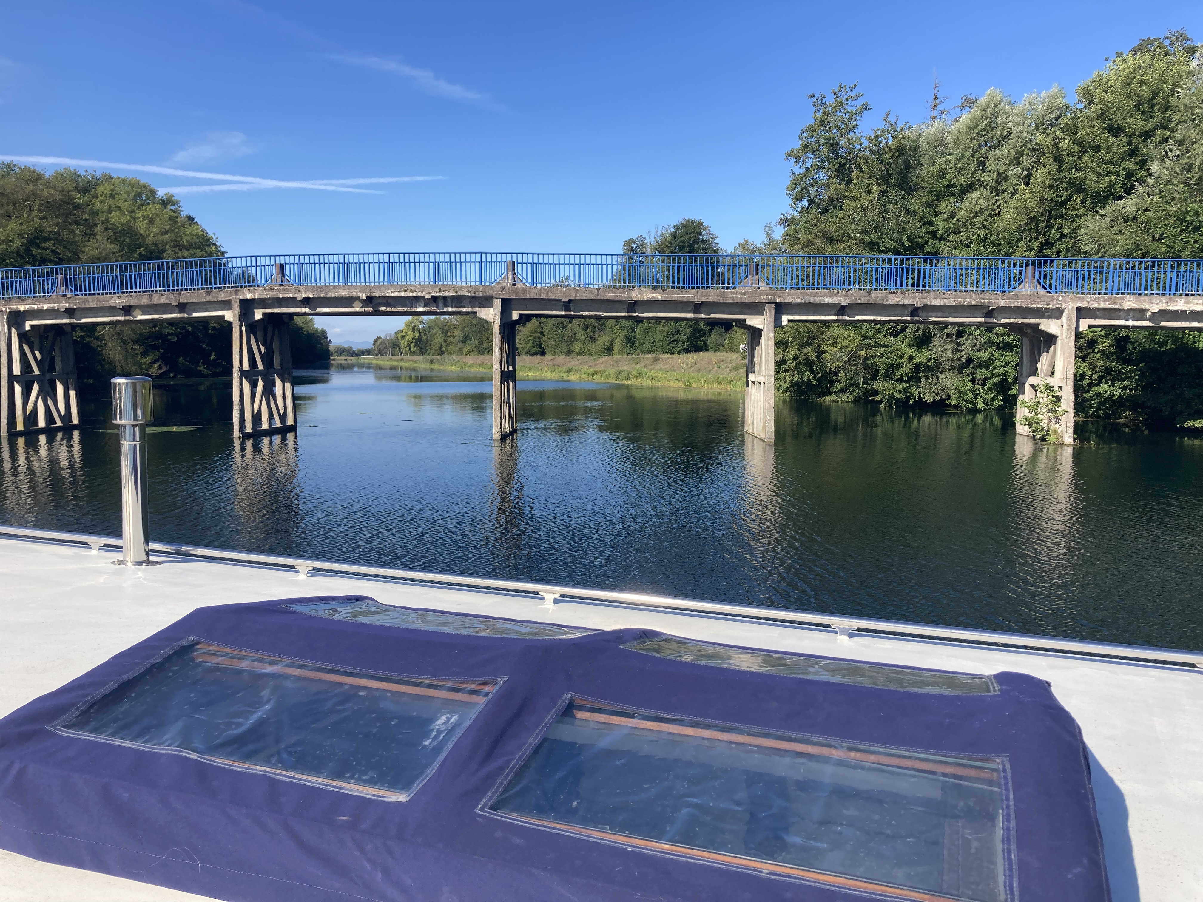 Next day we did not go far. We began by crossing the Canal de Décharge de l’Ill, essentially a man-made way for the river to escape ever since the canal system here was built. It meant , for us, going through a narrow barrage, which can be closed off to protect the canal Rhône au Rhin if l’Ill is in flood, then over the crossway, where on the day we crossed there was little flow of which to be wary.