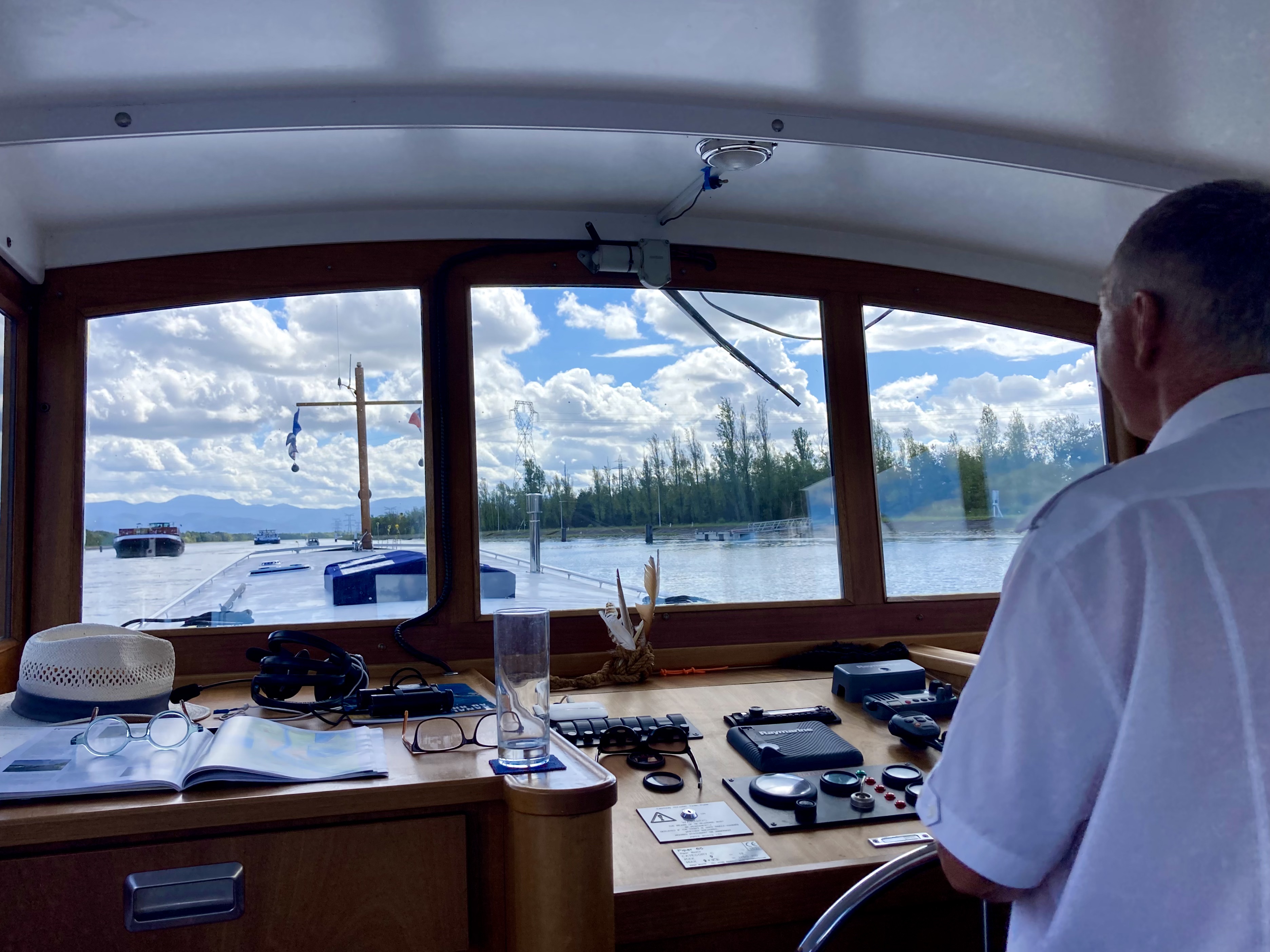 You will notice we now have our mast upright; it is normal for barges – commercial and pleasure – to travel with them half lowered to fit under the many low bridges we pass under, but with no such encumberments on the Rhine our pilot suggested raising it so that the VHF communication with the locks could be accomplished with more ease.