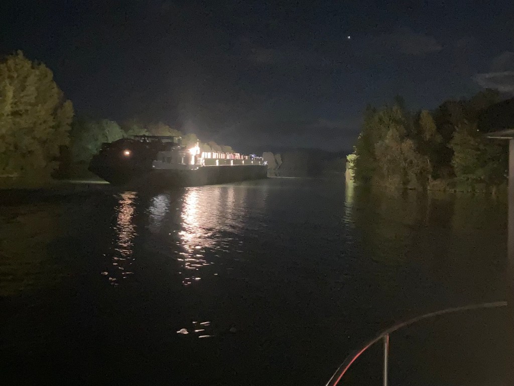 A big barge passing us, working late. Thank goodness we had our navigation lights on again!