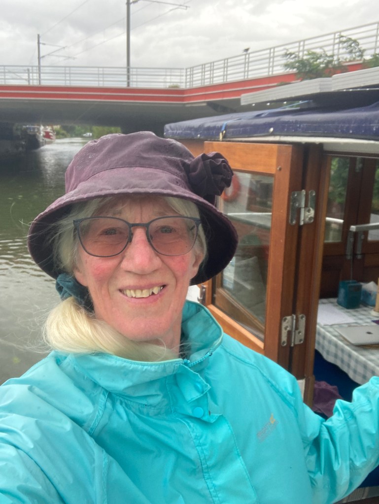 He remained cheerful in his wet weather gear even though travelling on his motor scooter between the locks.