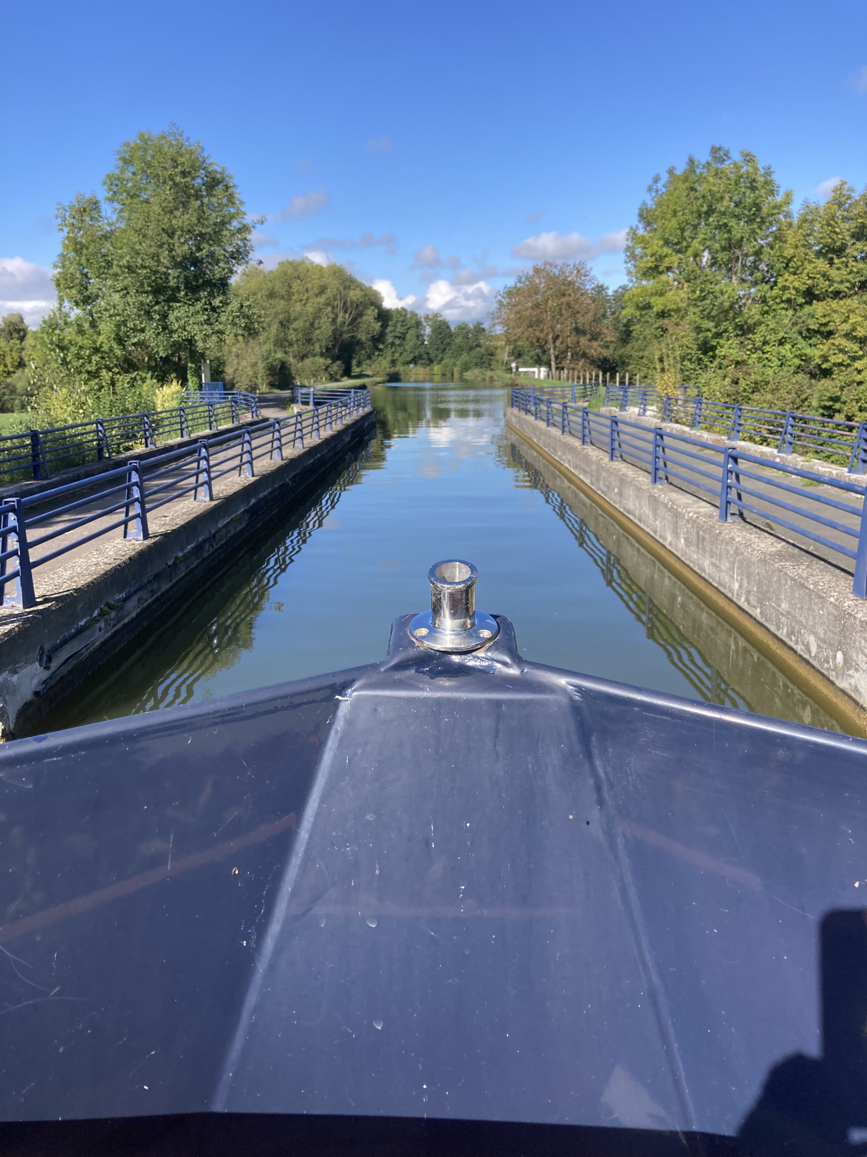 4 kilometres further on Captain Stu had to take a sharp turn to port into a narrow aqueduct over river l’Allan, followed immediately by a lock. By now we were alone, operating the locks with our super-large telecommand. So we were glad to get the green and red lights, meaning that the lock was preparing for us, before Calliope set forth across the aqueduct!