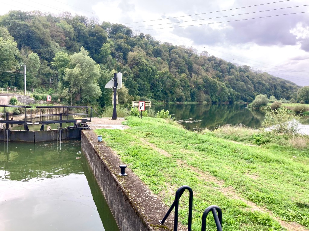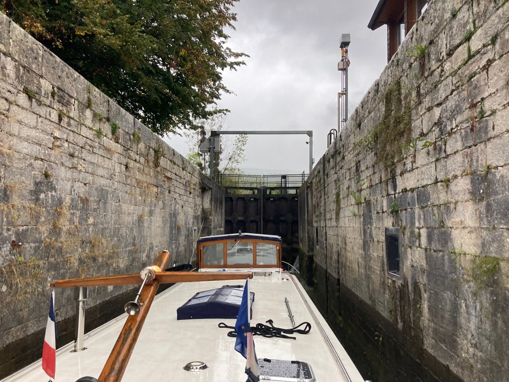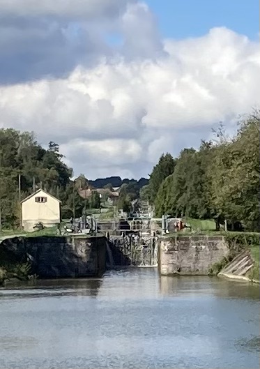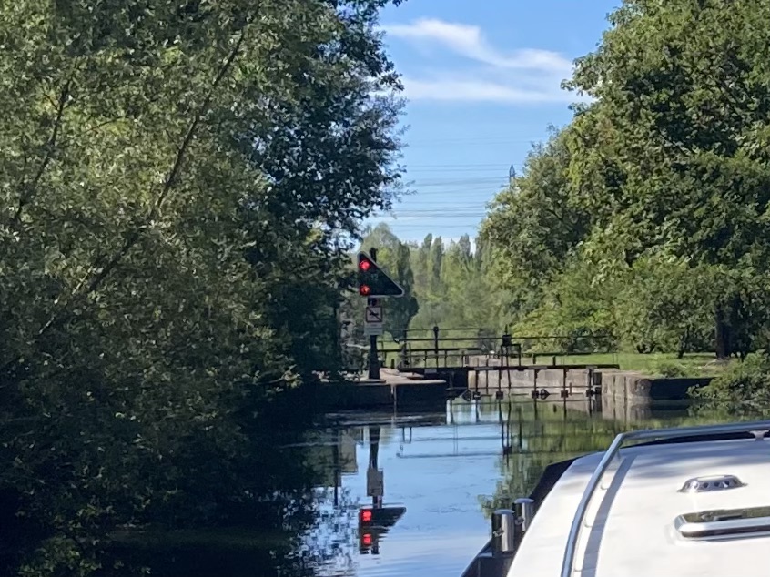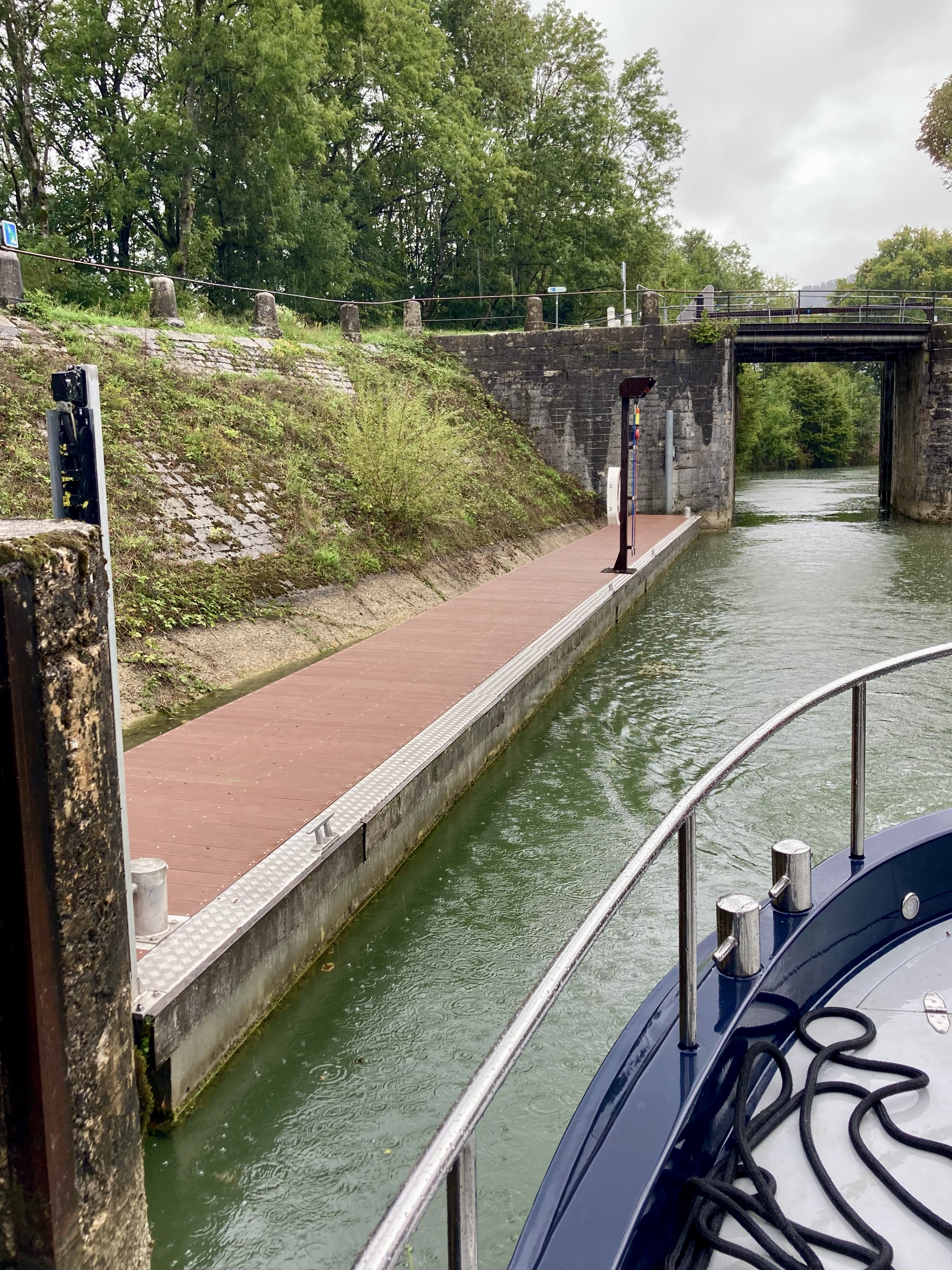 On leaving Dole we joined a lovely open river and headed across it towards the next lock, in sight and just a kilometre and a half away. We approached and saw a red light, partly open gates, but no boat emerging. It didn’t make sense. Using our remote control made no difference and we pulled into the waiting pontoon.