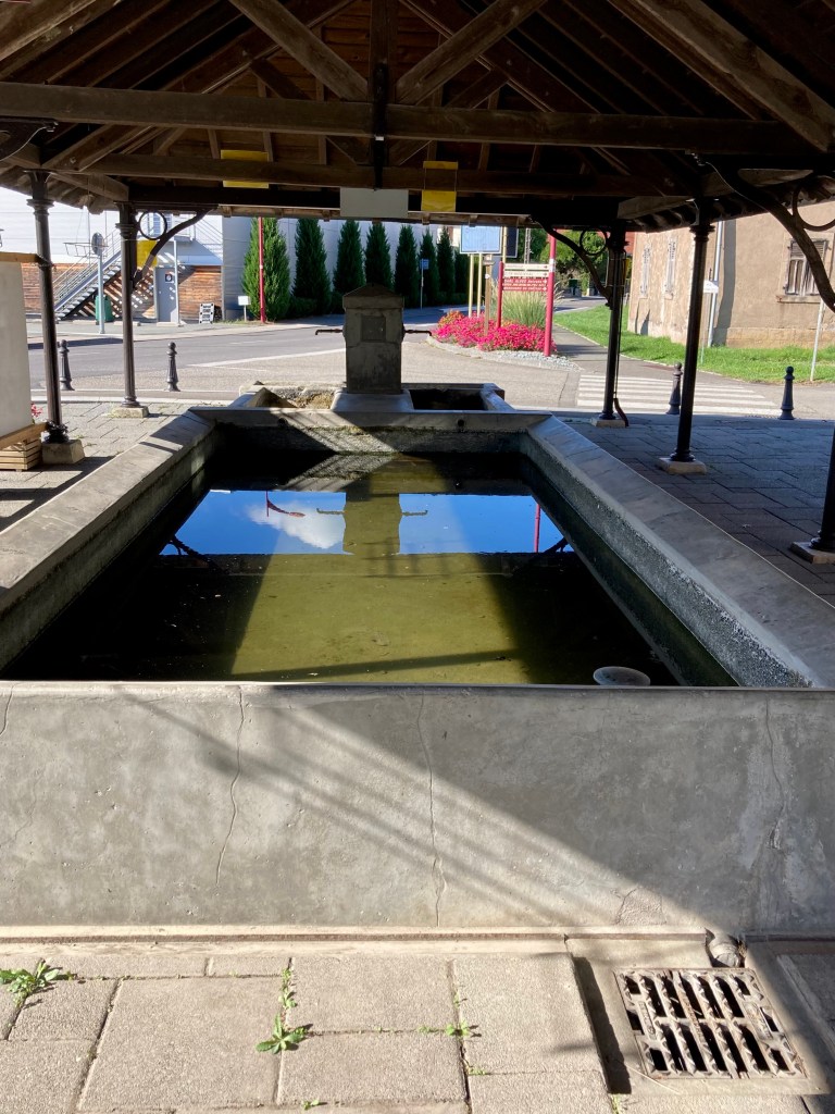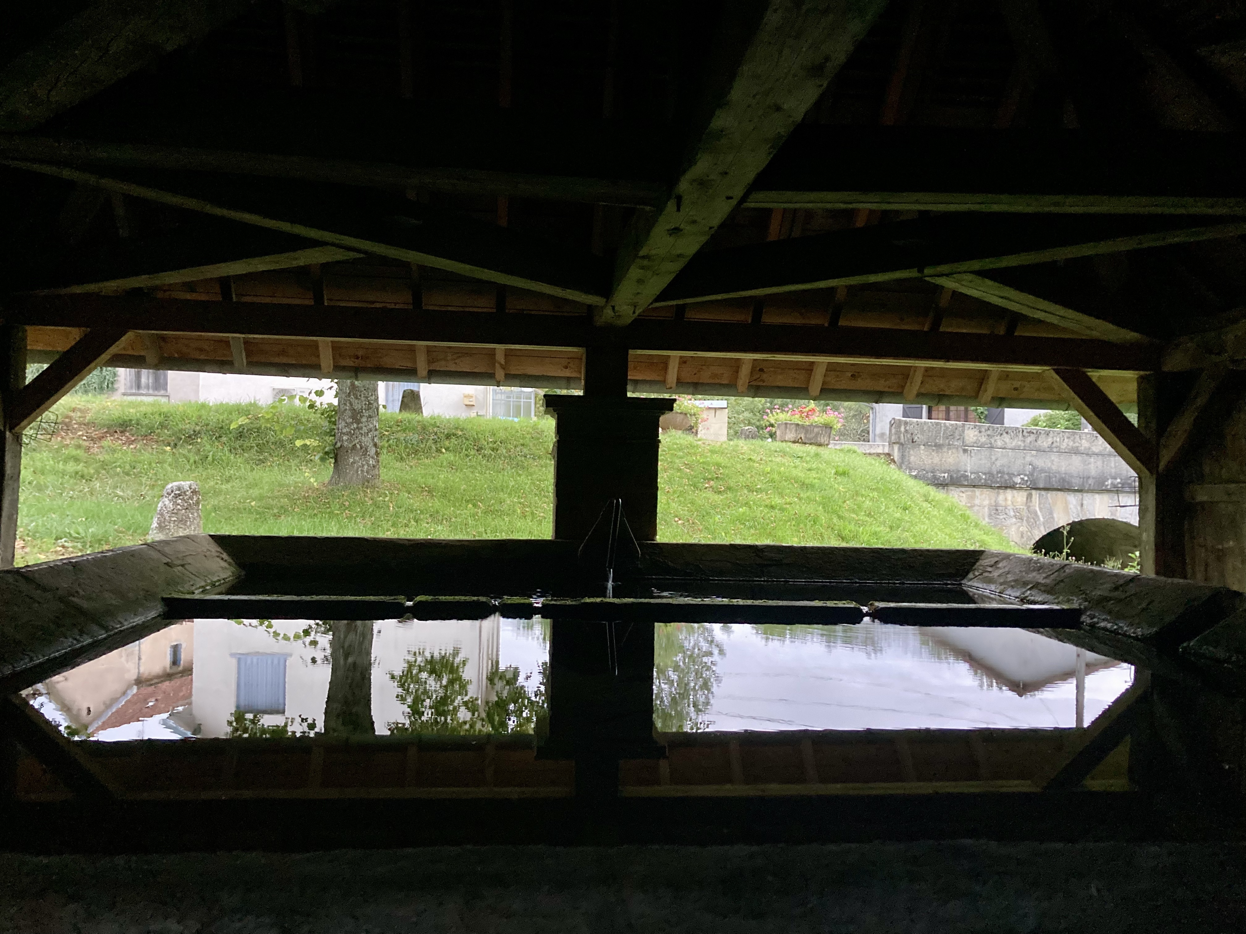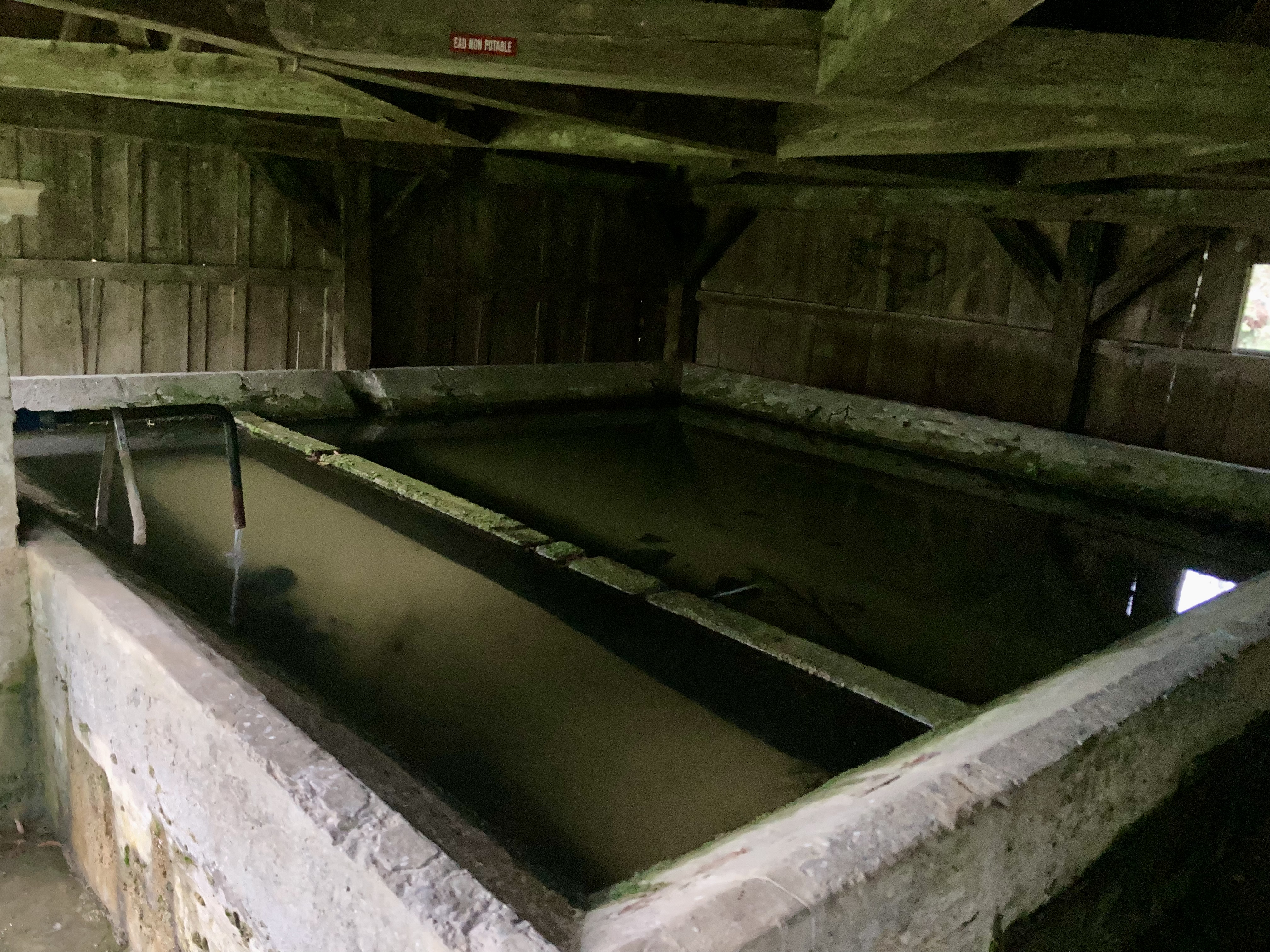 It was quite gloomy by time I got to this lavoir, so not so easy to se the features under the old beamed roof. But you can se the separate stone tanks of water, the fresh water constantly pouring in at one end, and the wooden pegs to hang things up.