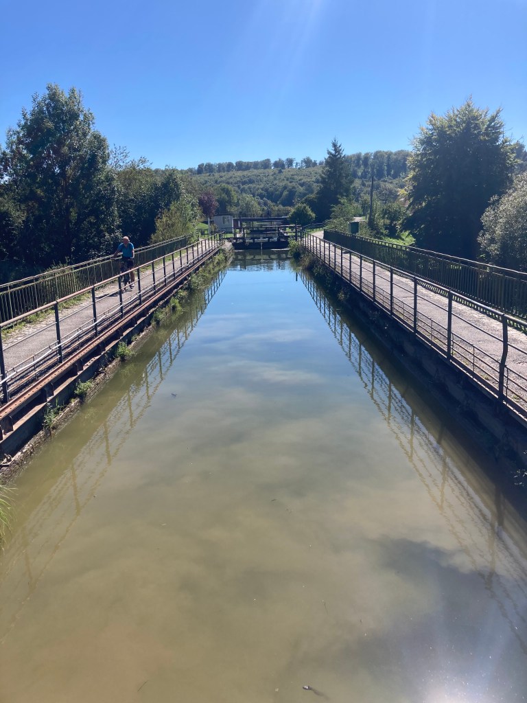 We were soon onto our second major day upwards, this time including a final rise of 9 locks in 1.5kms, and in total 15 over 4.5kms. But we began, as we left Dannemarie, going over a small ‘pont canal’, or aqueduct, over the river La Largue.
