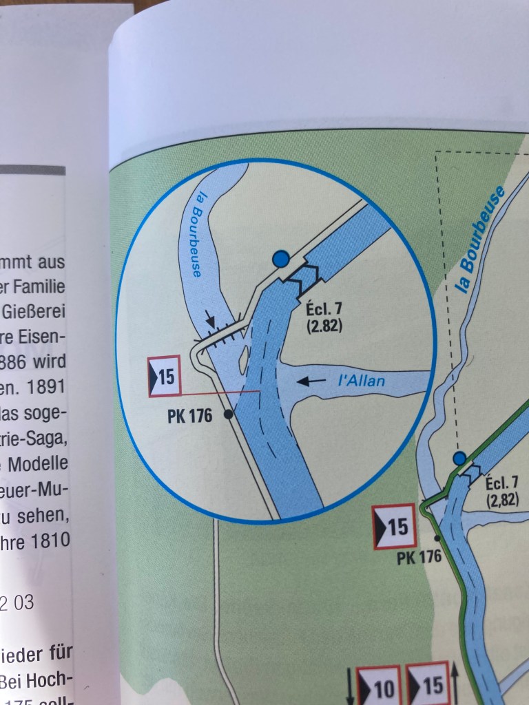 The following day we left Montbéliard, and we started off with a series of ‘narrows’. We were slightly caught unaware at first but a closer look at the map showed where each one was coming. They were due to the canal being squeezed between a road on one side and the river on the other. Some lead to locks, some lead to bridges, and some simply narrowed and then broadened out again.