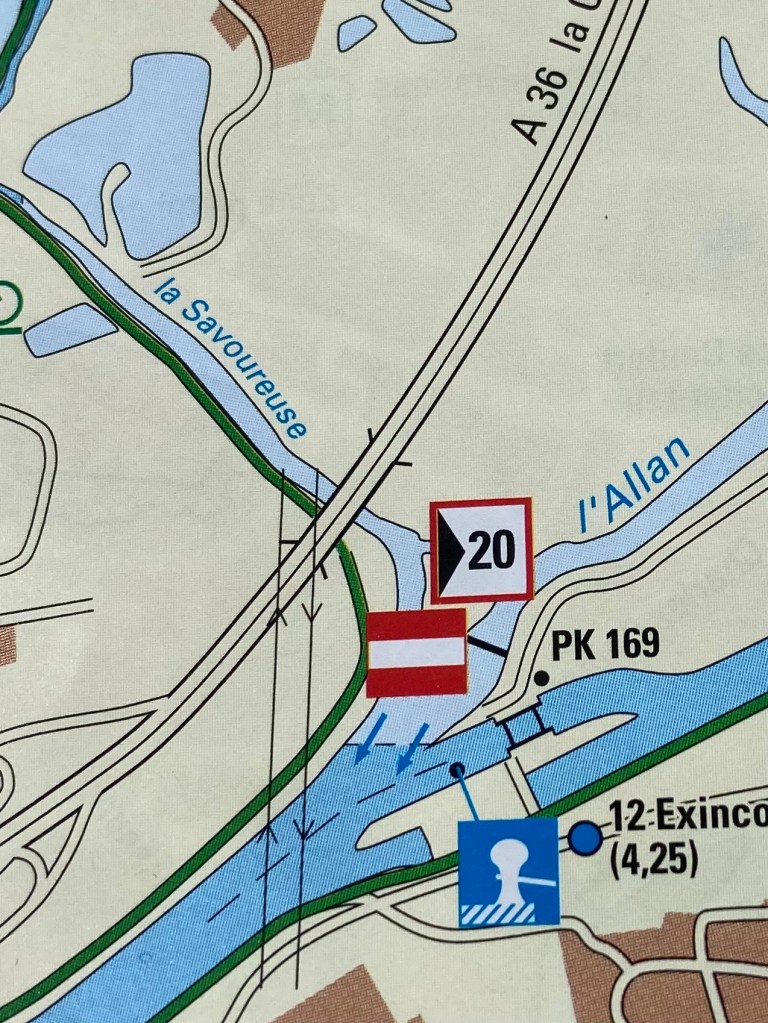 The meanderings of l’Allan continued, this time joining us just after lock 12 at the point where another river, la Savoureuse, entered the downstream flow.