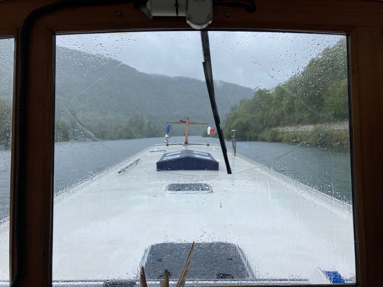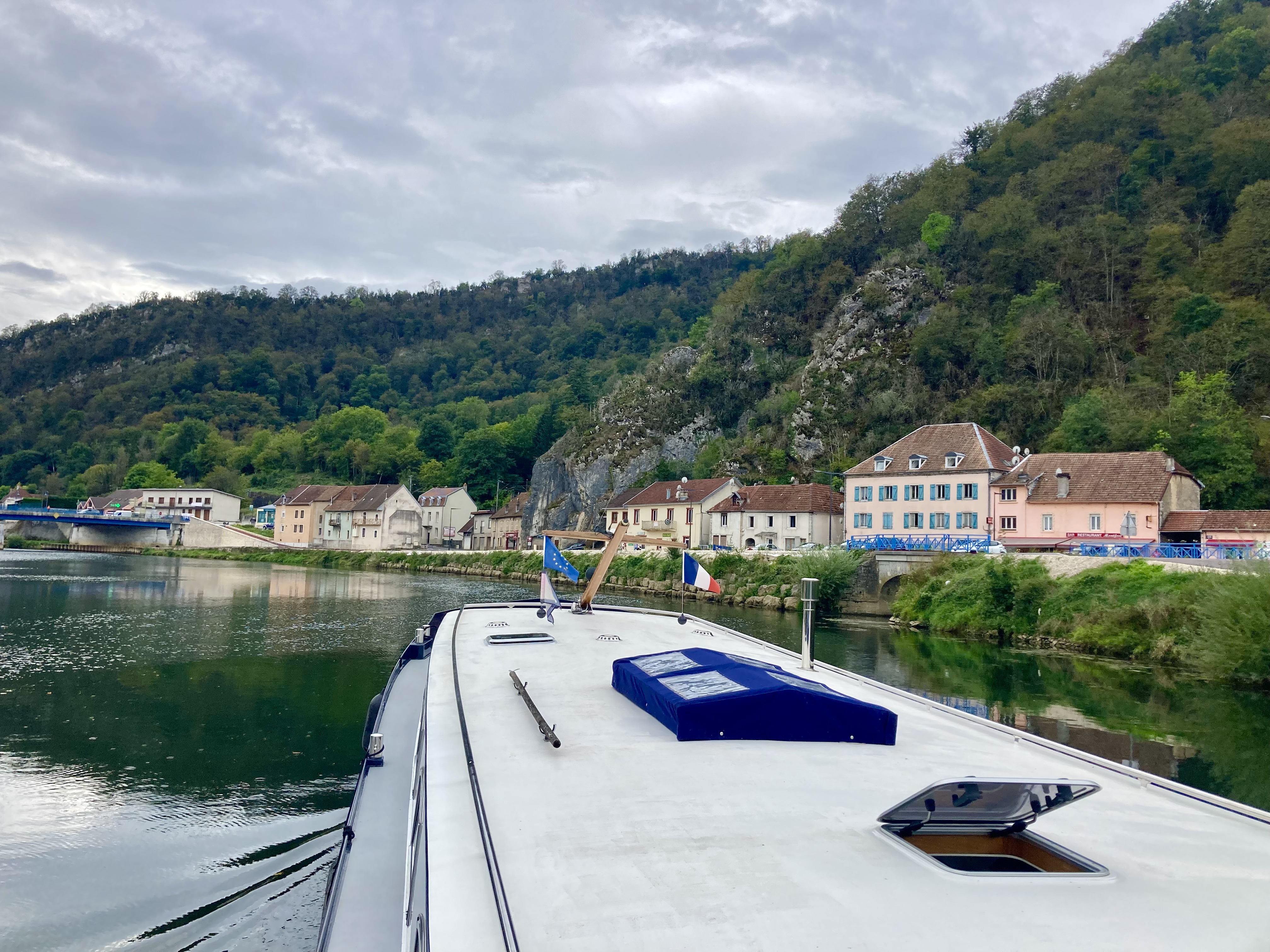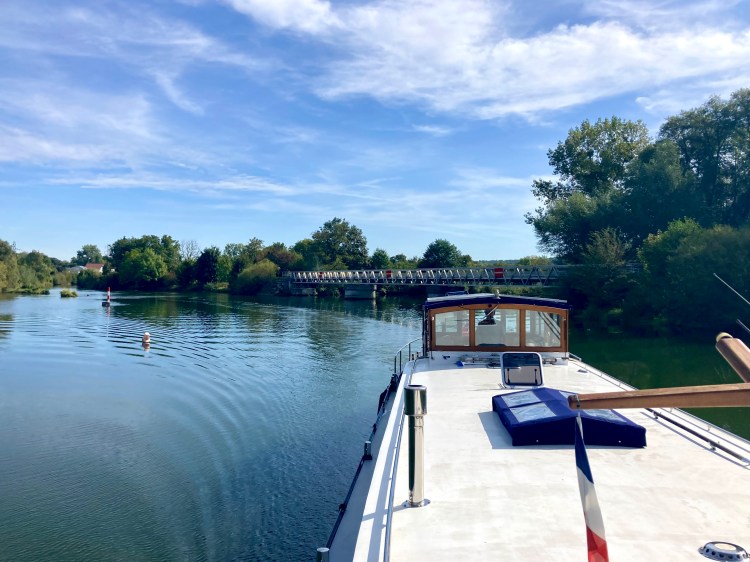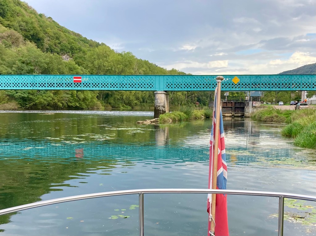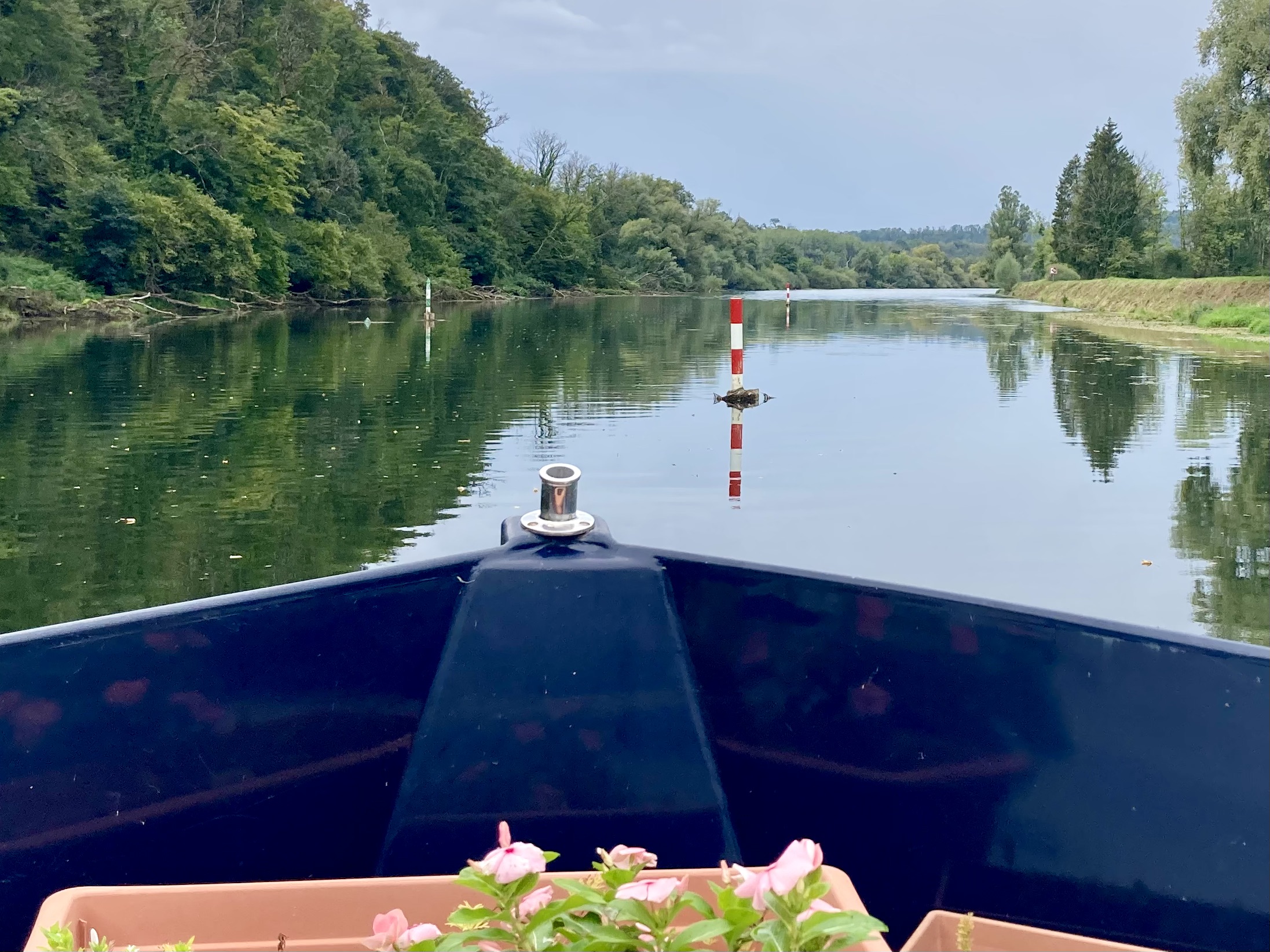 Luckily for us it was a calm day and we could enjoy the view. The bridge ‘above’ Calliope’s wheelhouse is the bridge across the Doubs seen on the map; the red buoys are visible too.