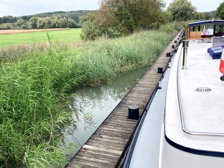 We had been heading for a mooring at l’Isle-sun-le Doubs, but decided on an earlier stop after our delay. Both the eclusiers and the DBA recommended a wooden pontoon out in the country, very peaceful and quiet. We moored up there and it was just as promised.