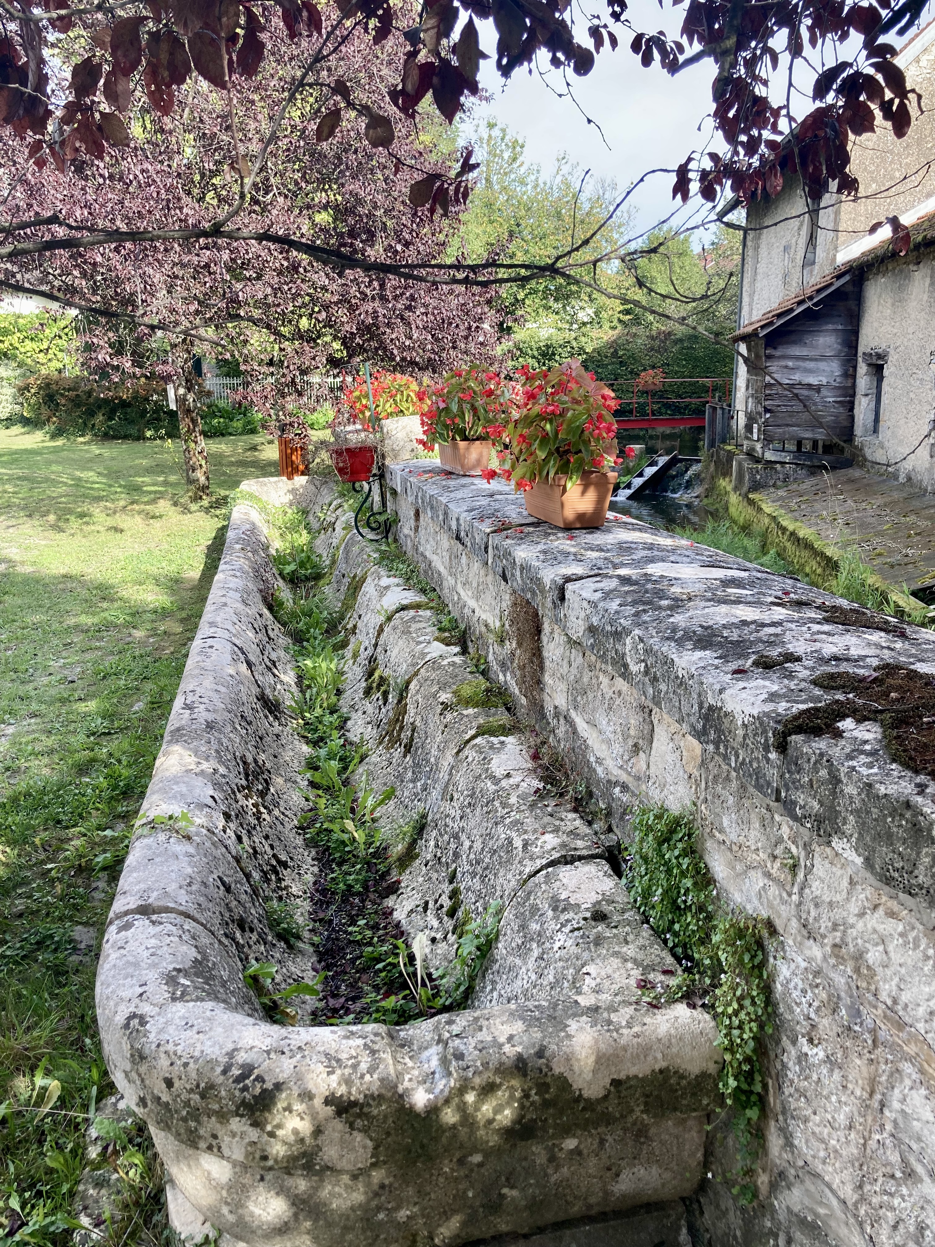 We took a walk round the little local village (Colombier-Châtelot), scarcely more than a hamlet, where a large stream flows through and has obviously powered a mill in the past. It also must have supplied water for this lovely stone structure – simple lavoir or cattle trough?? I think the former because of the groove to allow water to flow out at the lower end.
