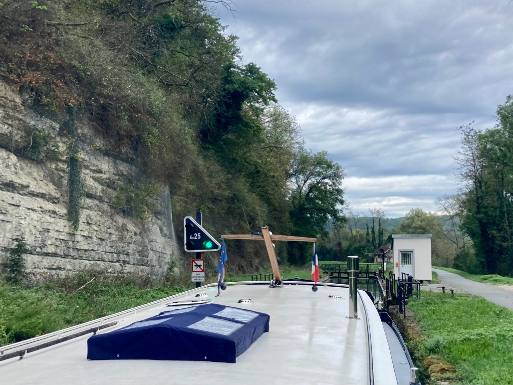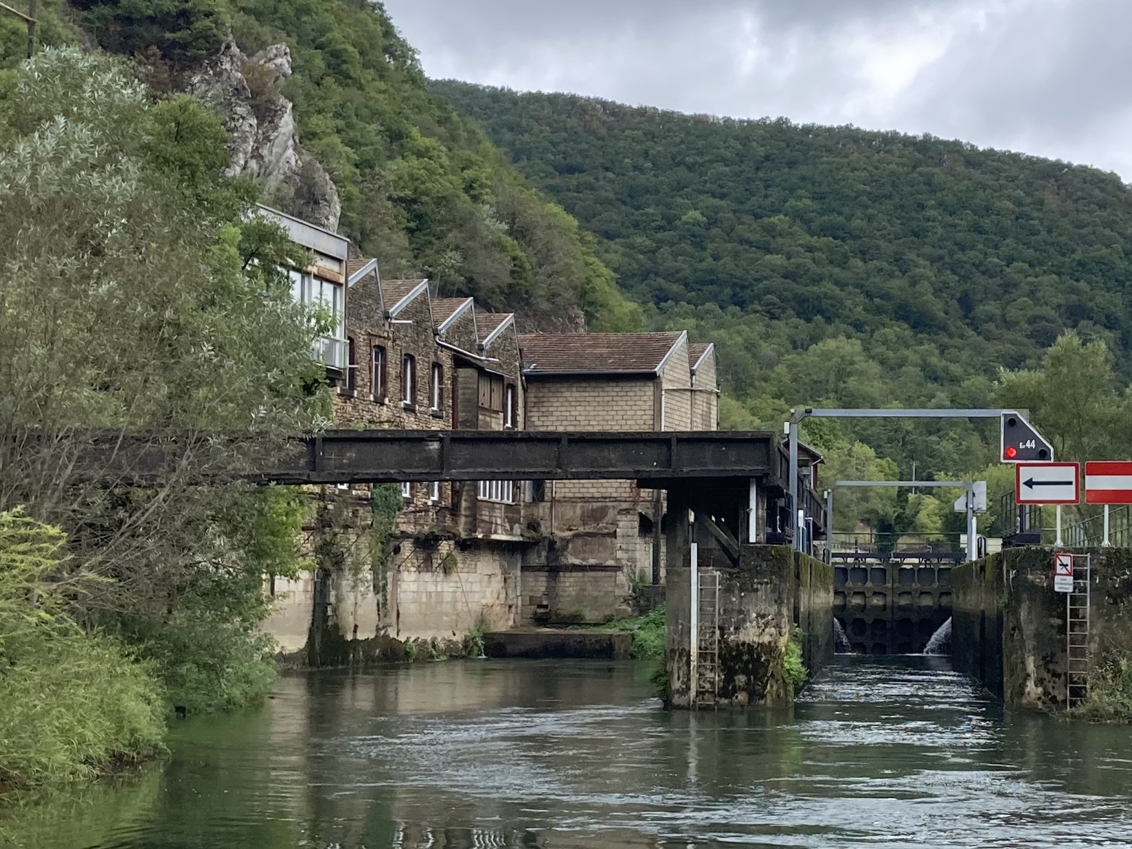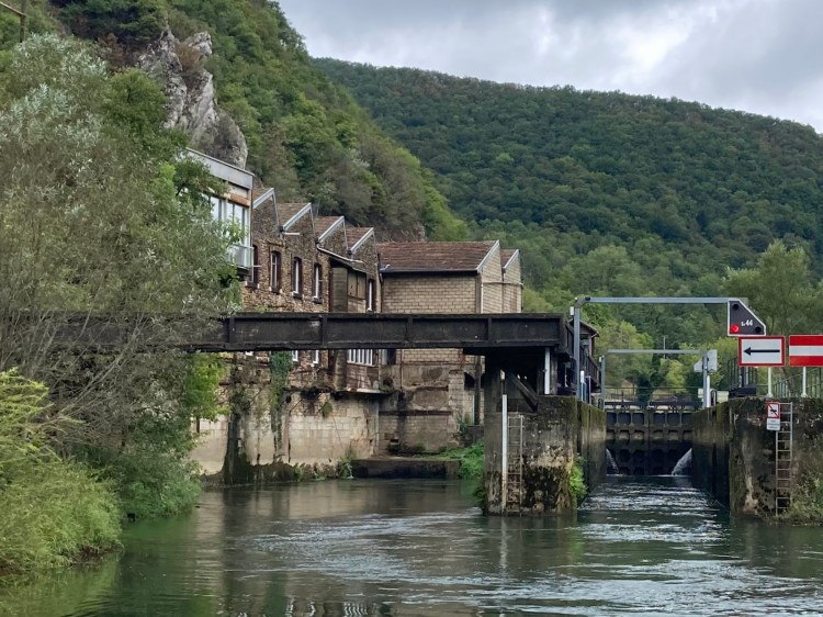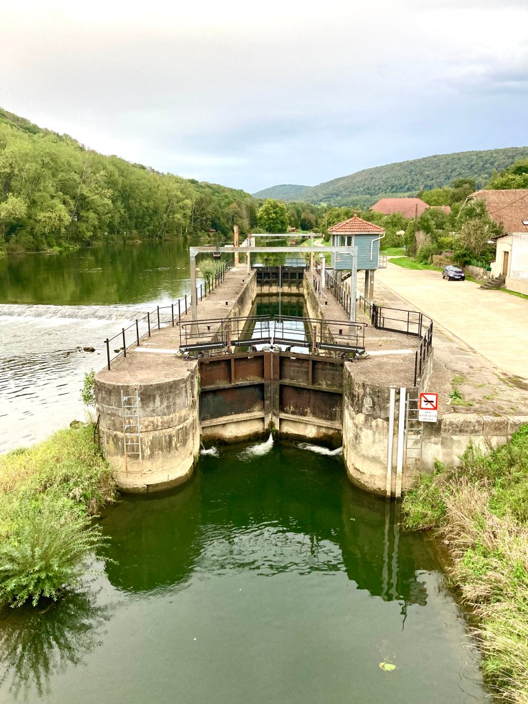 We were clearly right alongside the river Doubs now – in fact we were squeezed between the rocky cliff of the valley and the river itself, as you can see at this lock.