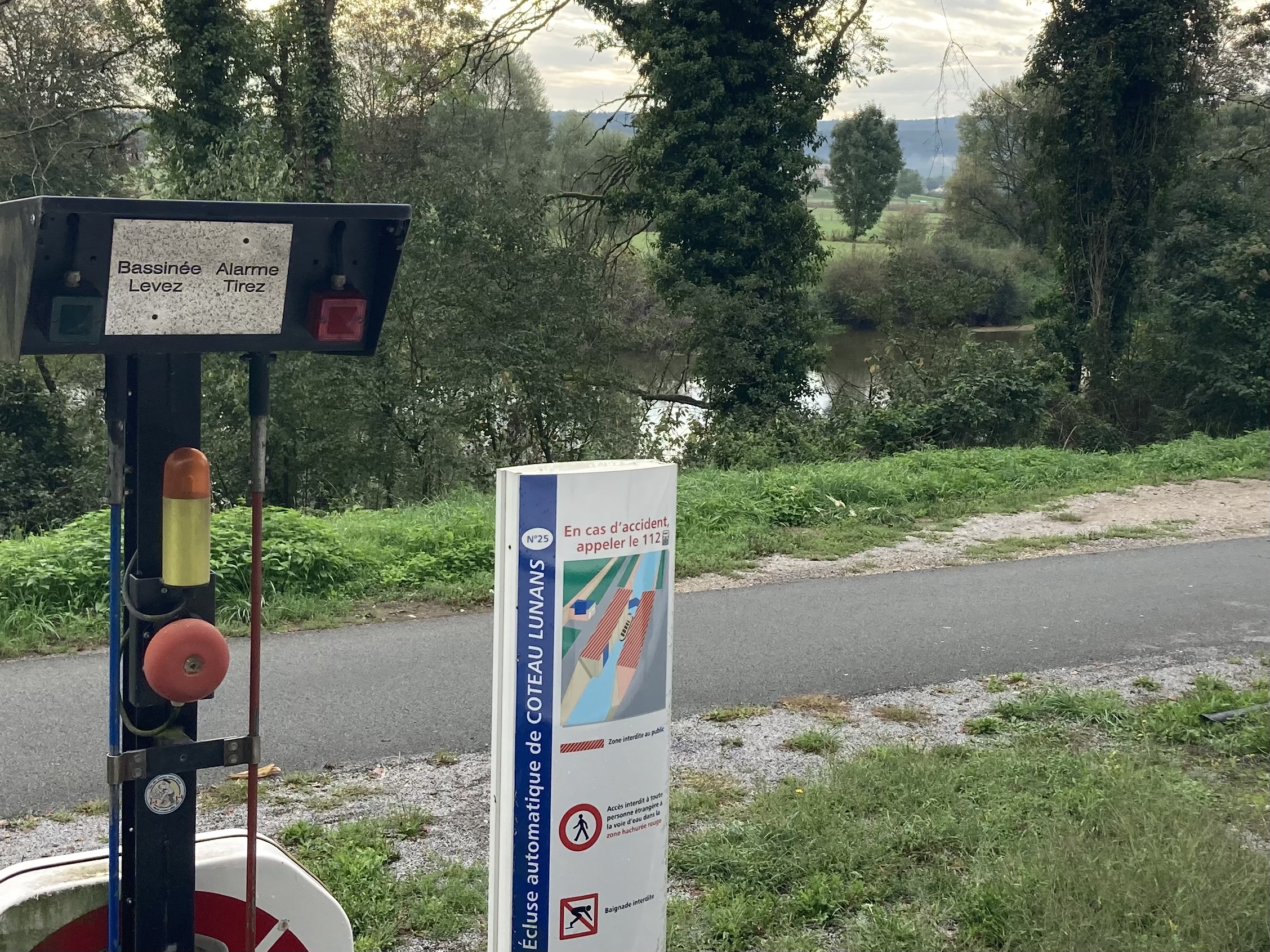 That lock gave me a bit of a surprise; at each lock you push up the blue lever to set it in motion; an alarm bell rings to indicate the lock gates are closing.