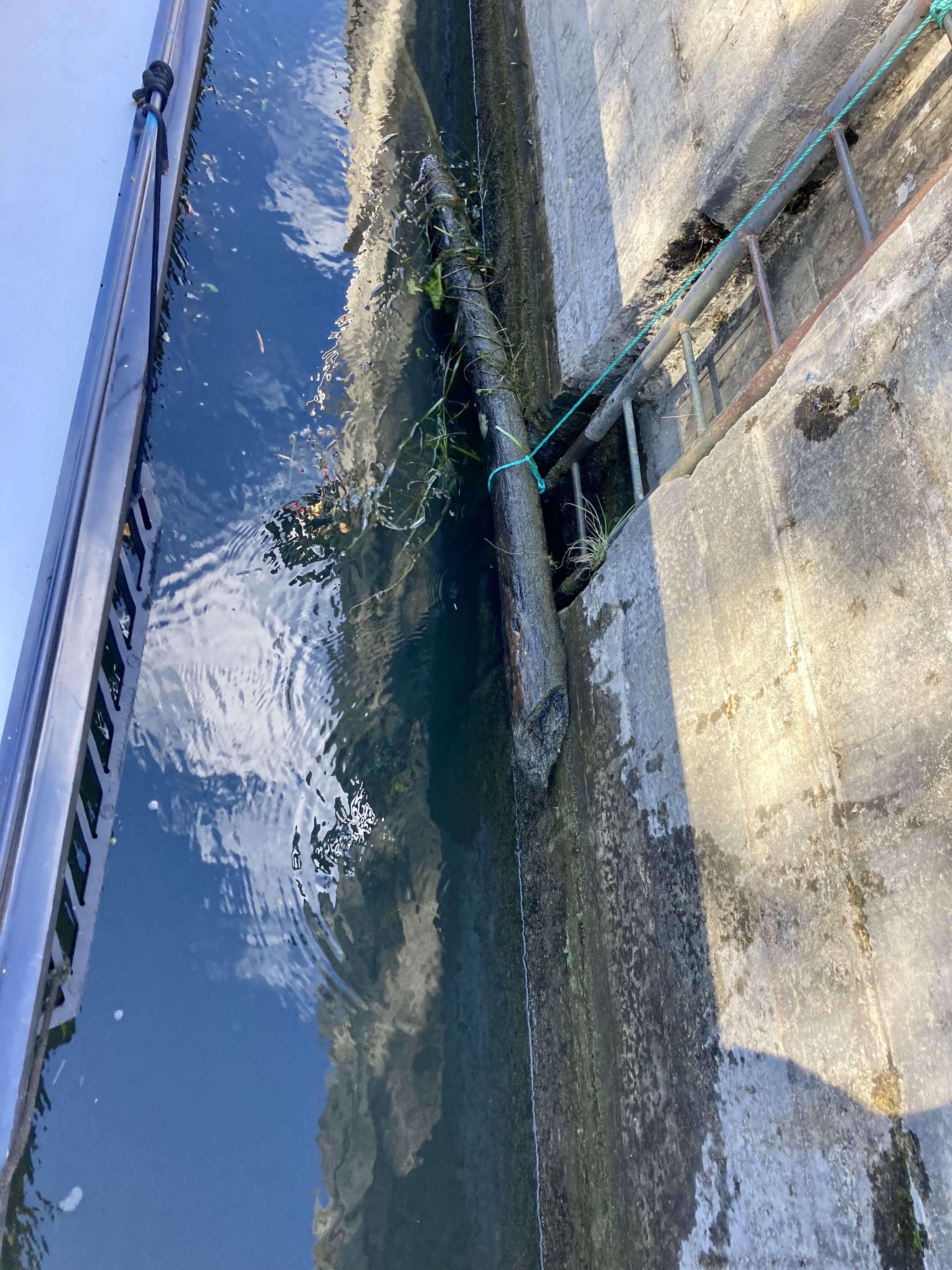 Together, with a variety of boat hooks, rakes and rope, we managed to bring the log to one side of the lock and secure it to the ladder. Hooray. At last the lock could operate, and we could all proceed.