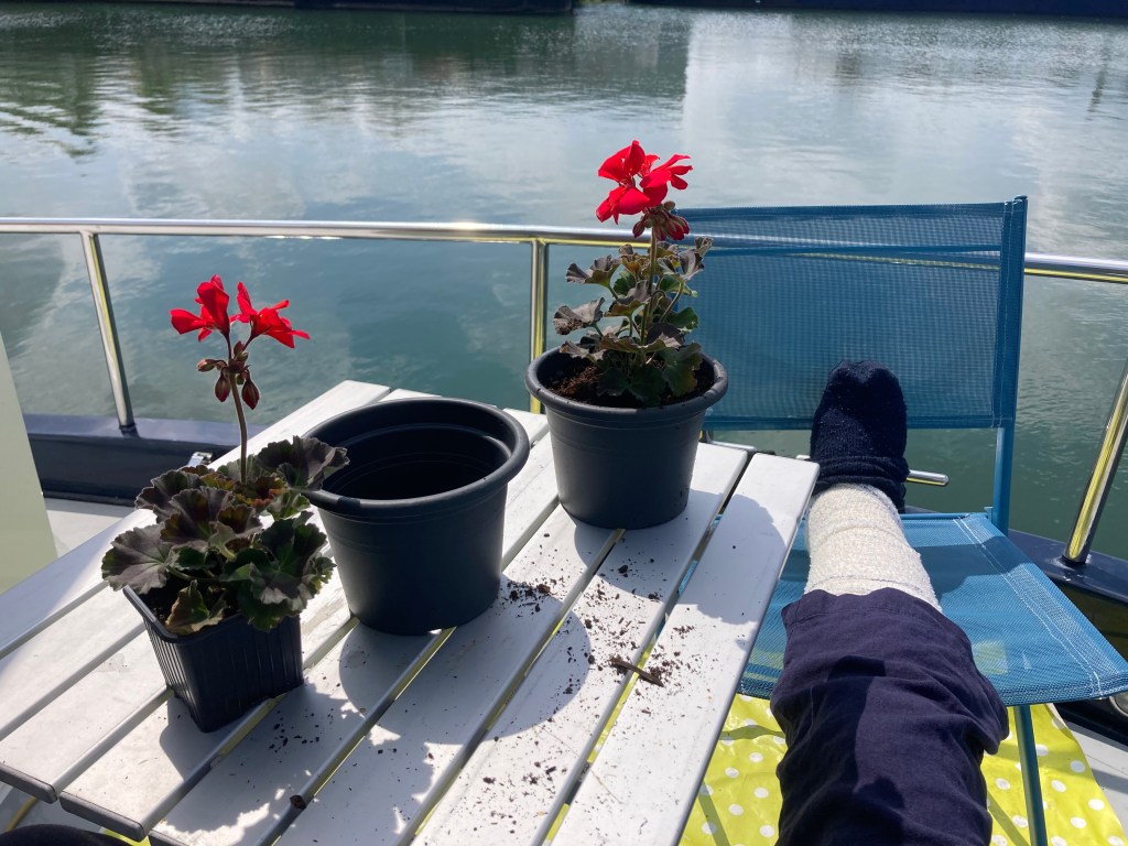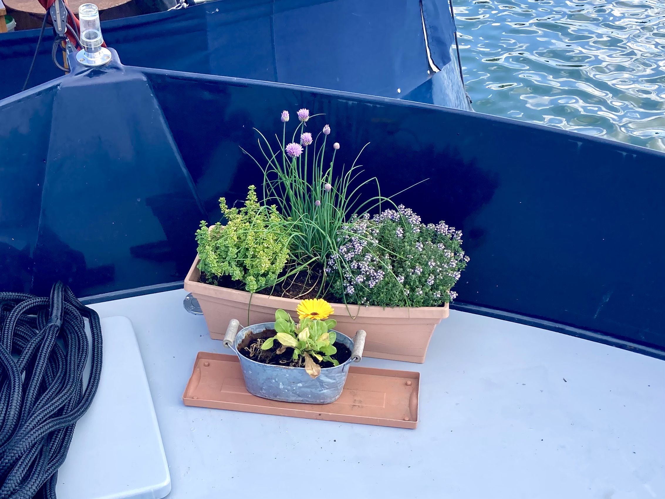 Meantime I made an attempt at developing this year’s on board garden, using plants we had luckily bought a few hours before the ankle incident. There was also a marigold that had somehow survived the winter and was determined to bloom. Together they brighten up Calliope.
