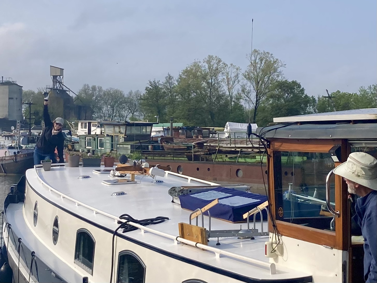 And then Salon Fluvial was over. It took a few days for boats to gradually leave, each one’s leaving accompanied by the tootling of barge horns, and mass waving. Here we provide a send off for Tesserae; new friends who had been moored alongside us for almost a week ……….