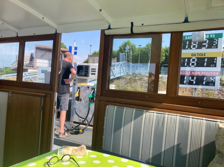 First task before we left the St Jean-de-Losne area was to fill up with diesel from the fuel pontoon. It is self service, or is when it works; note Stewart’s perplexed pose! But a reboot of the system by the tourist office and trying a different bank card soon had it sorted.