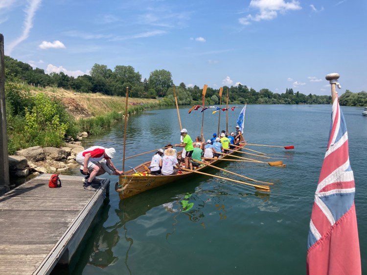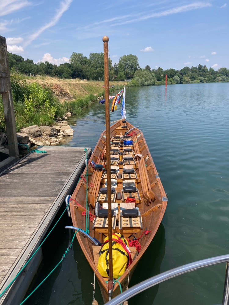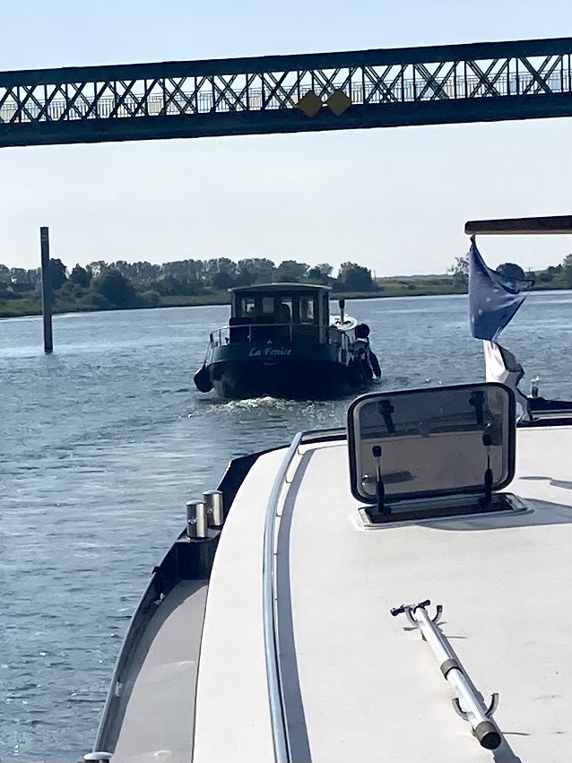 Two animated Dutchmen came quickly along the pontoon to tell us that they were the advance party for an ancient boat being rowed by 16 people upstream, and expecting to moor just where we were for their lunch break!