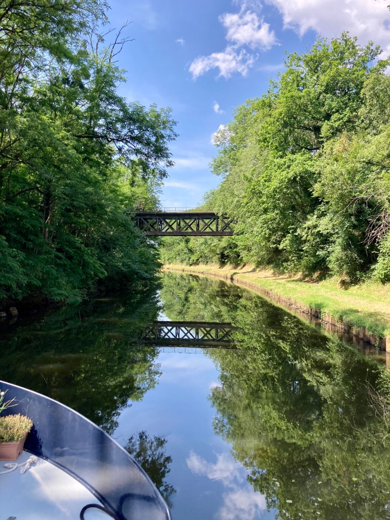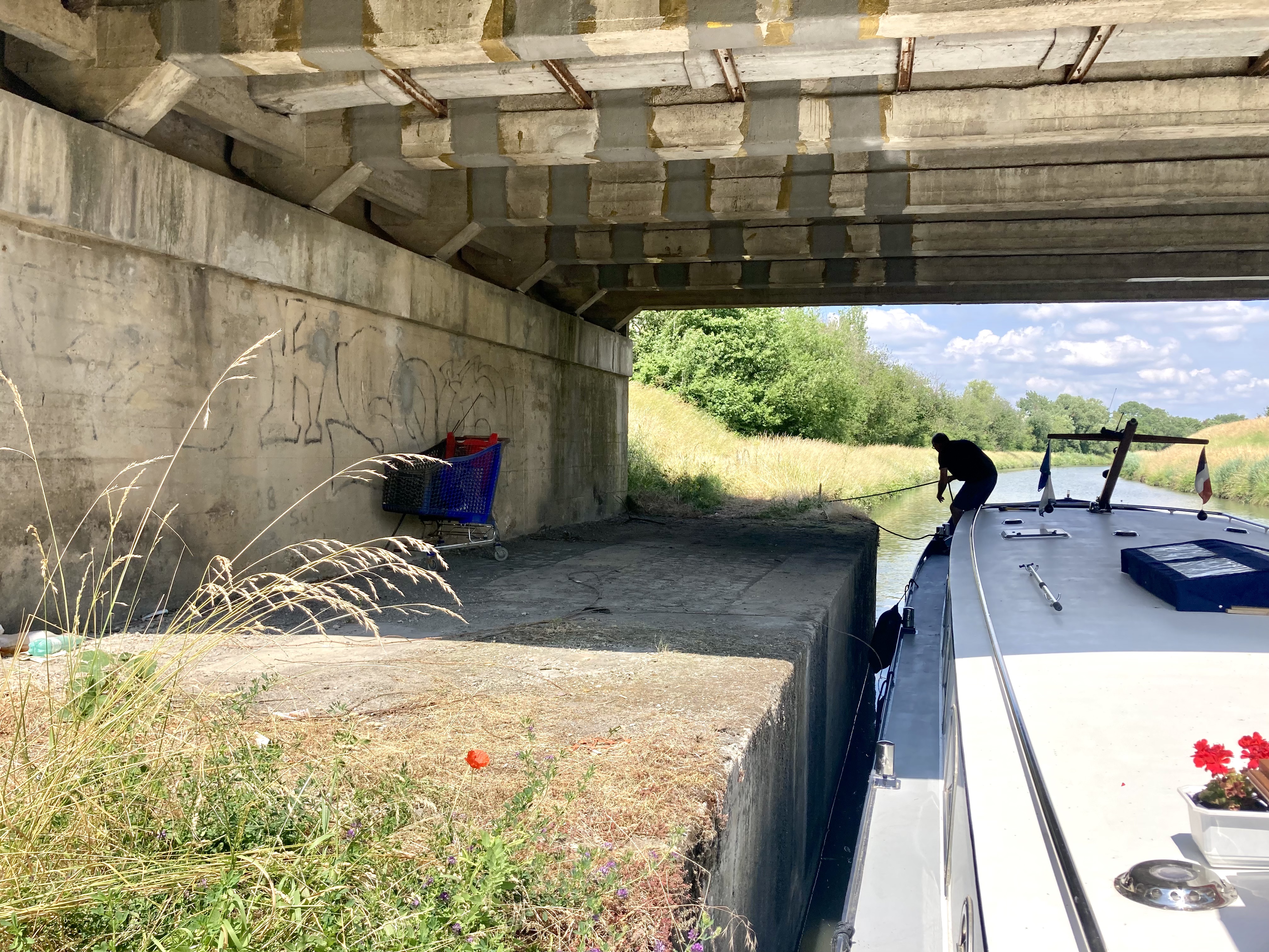 We had booked a mooring for two nights at Fragnes, not far from the Saône junction; our space was occupied by a hotel barge until 1 pm that day so we looked for somewhere to moor up, have lunch, and wait. Under this bridge was our only option!