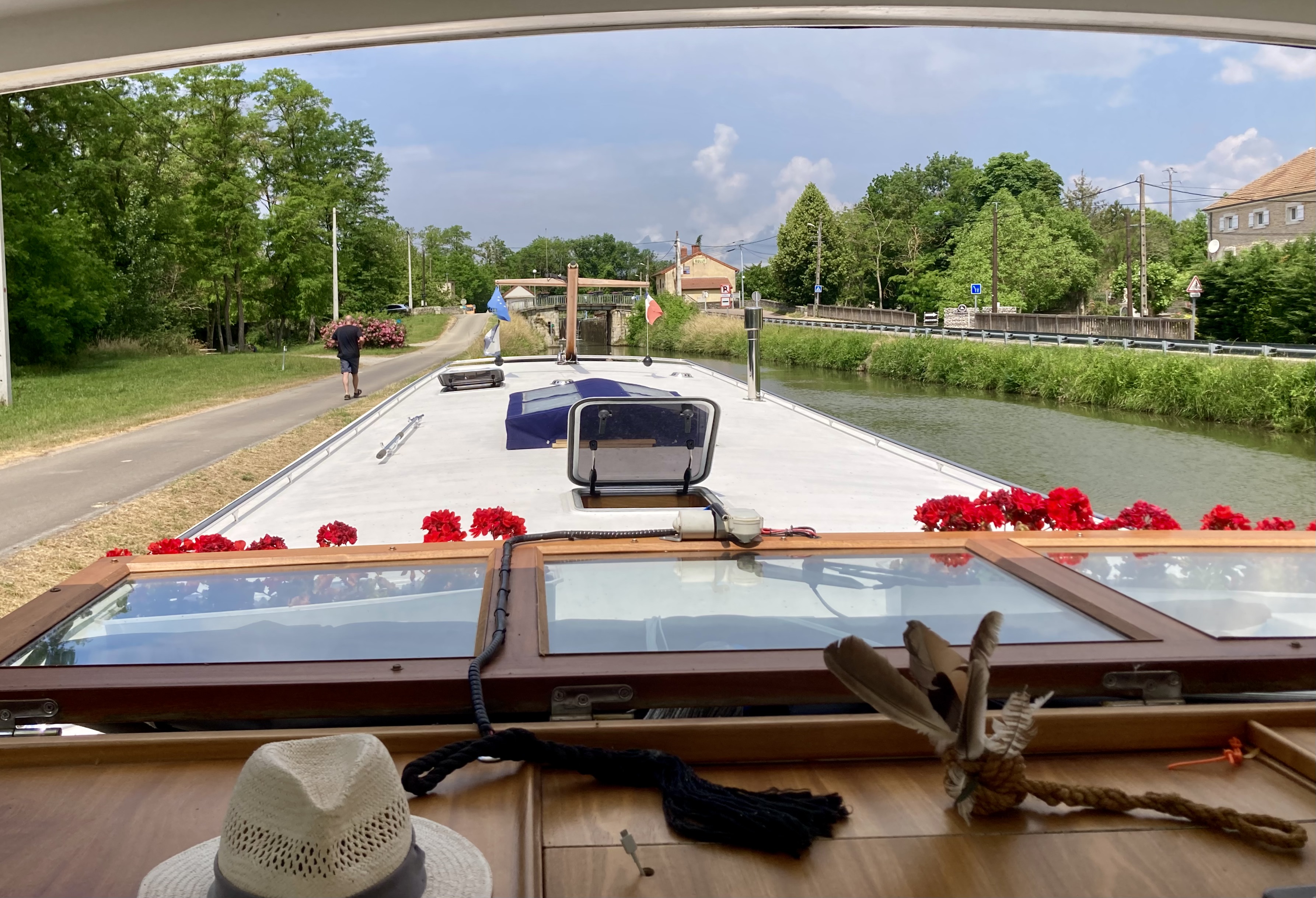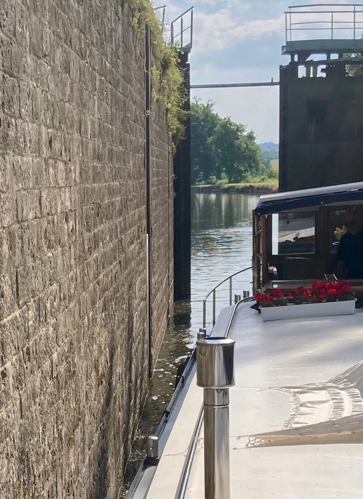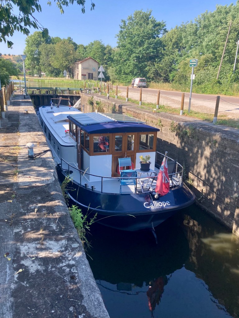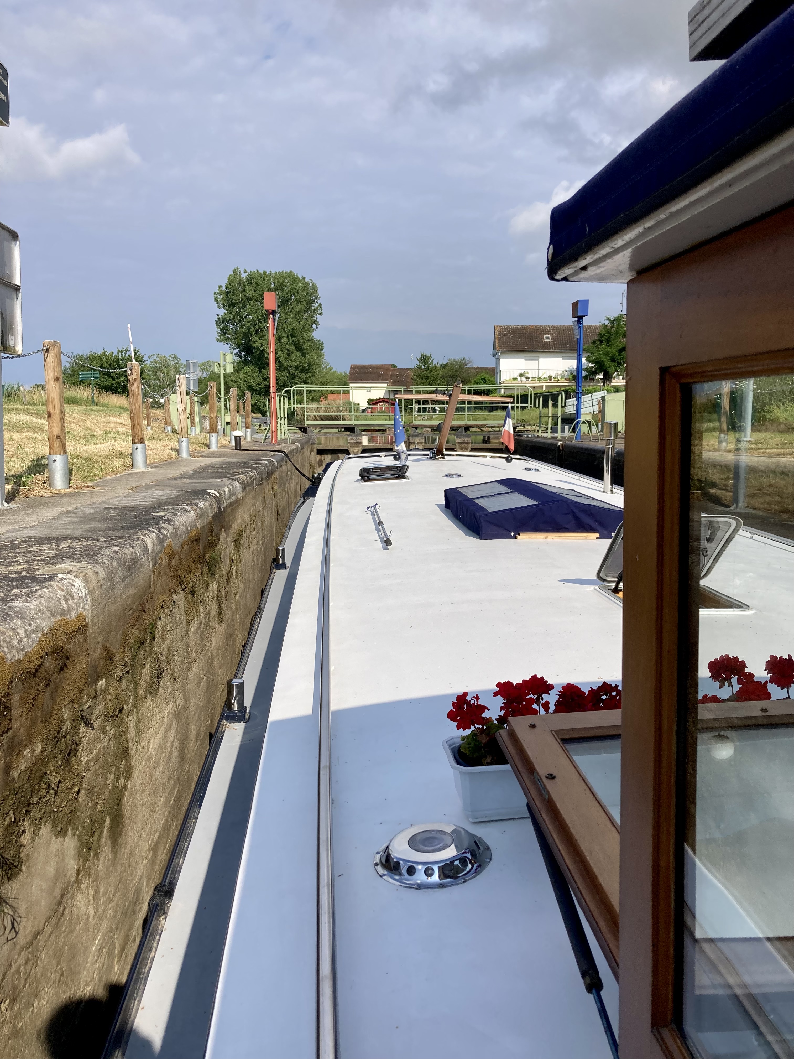 We left La Saône and came onto the Canal du Centre on a beautiful day. It’s quite a rise from the river water level to that of the canal, but the deep lock is very gentle with its rising bollards, and we ascended happily.