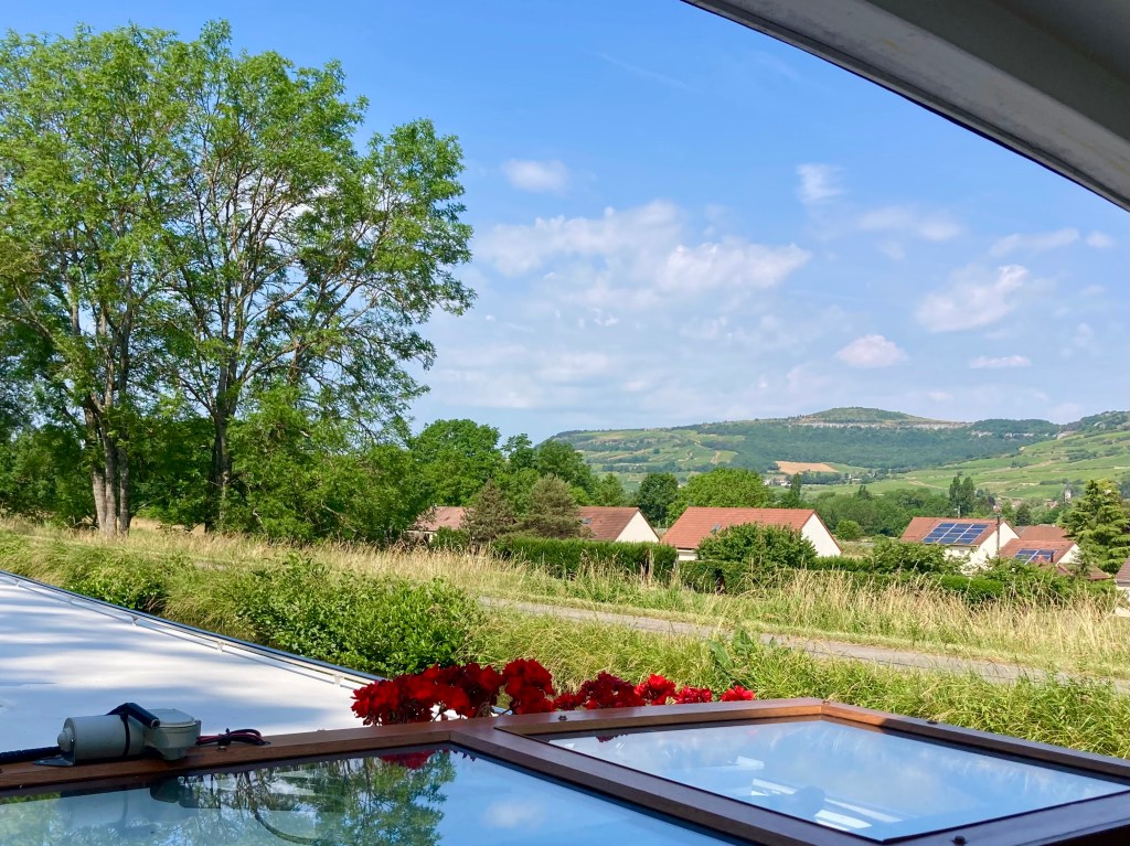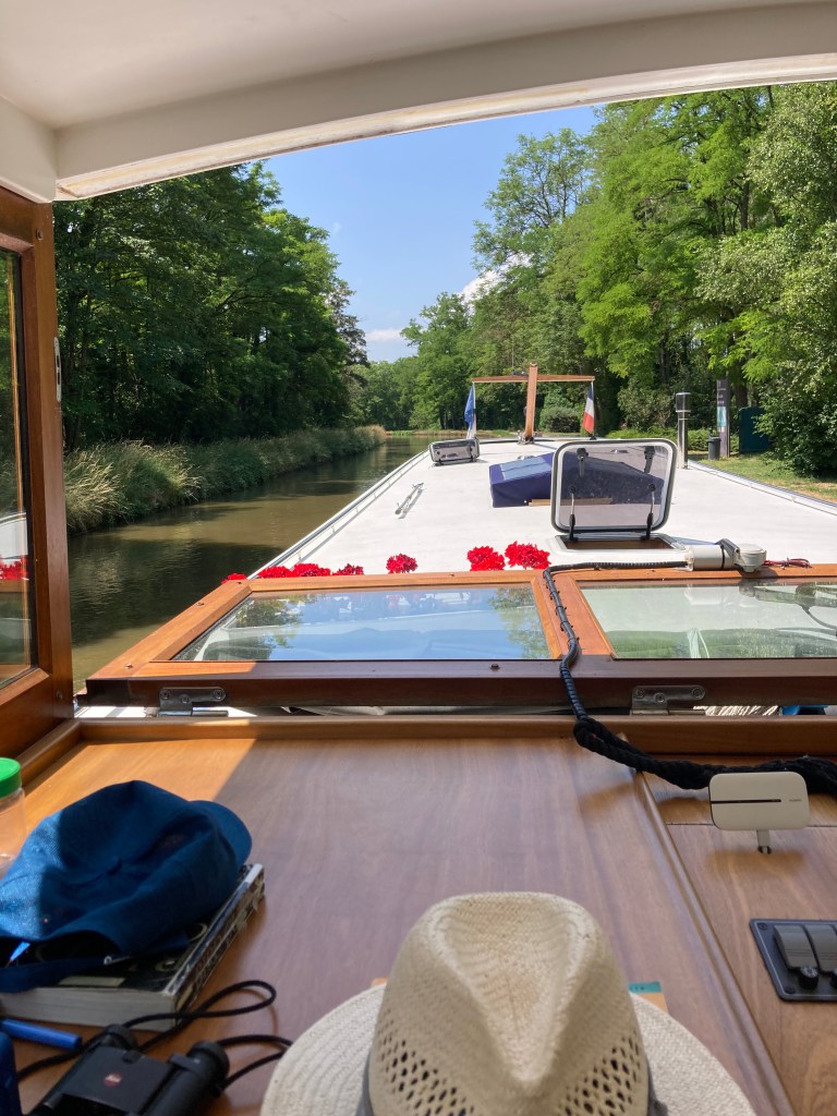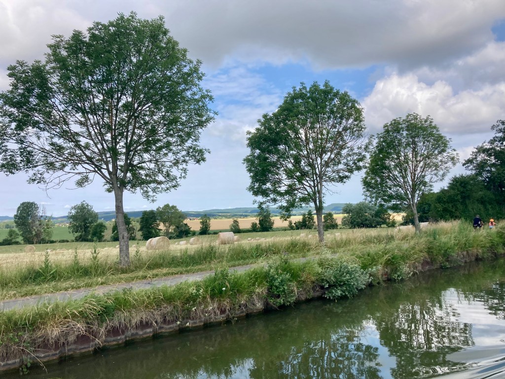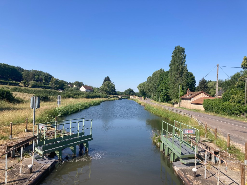We left La Saône and came onto the Canal du Centre on a beautiful day. It’s quite a rise from the river water level to that of the canal, but the deep lock is very gentle with its rising bollards, and we ascended happily.