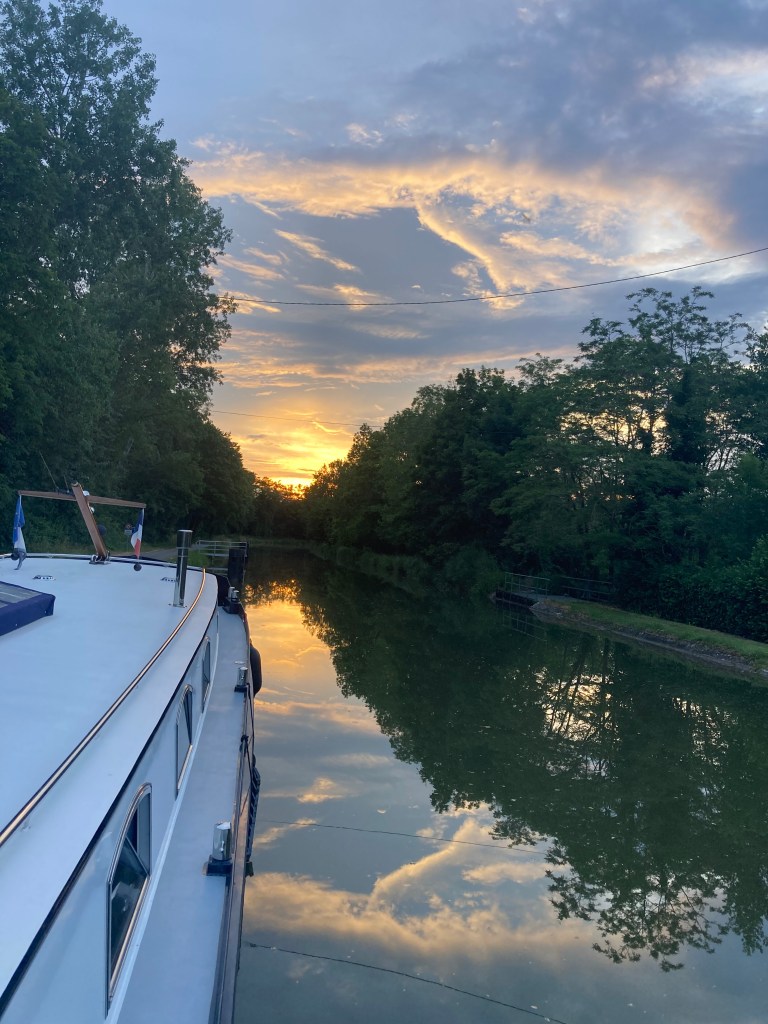 We had a sort of plan to spend the night around Chagny, but when we came up through our 11th lock of the day, Ecluse 24M, we saw two bollards set in grass in a quiet rural spot and decided to make this our Sunday night place of rest.