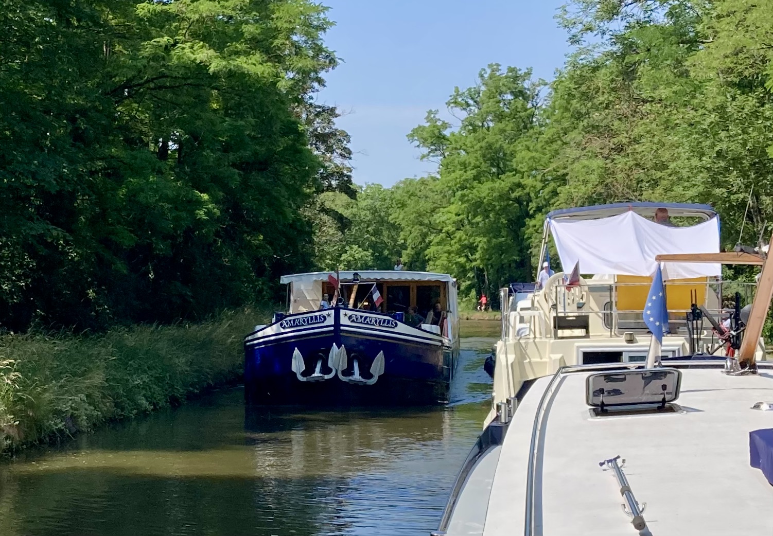 When we reached Santenay, our next chosen stopover, we understood the comment we had read about hotel barges squeezing past. Actually there is plenty of room and the Captains of these craft are good helmsmen and women. Amaryllis, who we had last seen at Sant Usage before we set off, cruised smoothly past, with a friendly greeting from the crew.