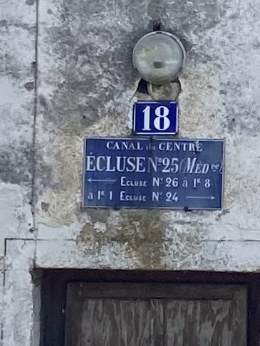 And here we are at the top, with this wonderful mural painted onto the redundant lock keeper’s tower. At the top the two gentle mermaids (do canals have mermaids?) tell us which side goes towards the Saône and Mediterranean, and which towards the Loire and the Ocean.