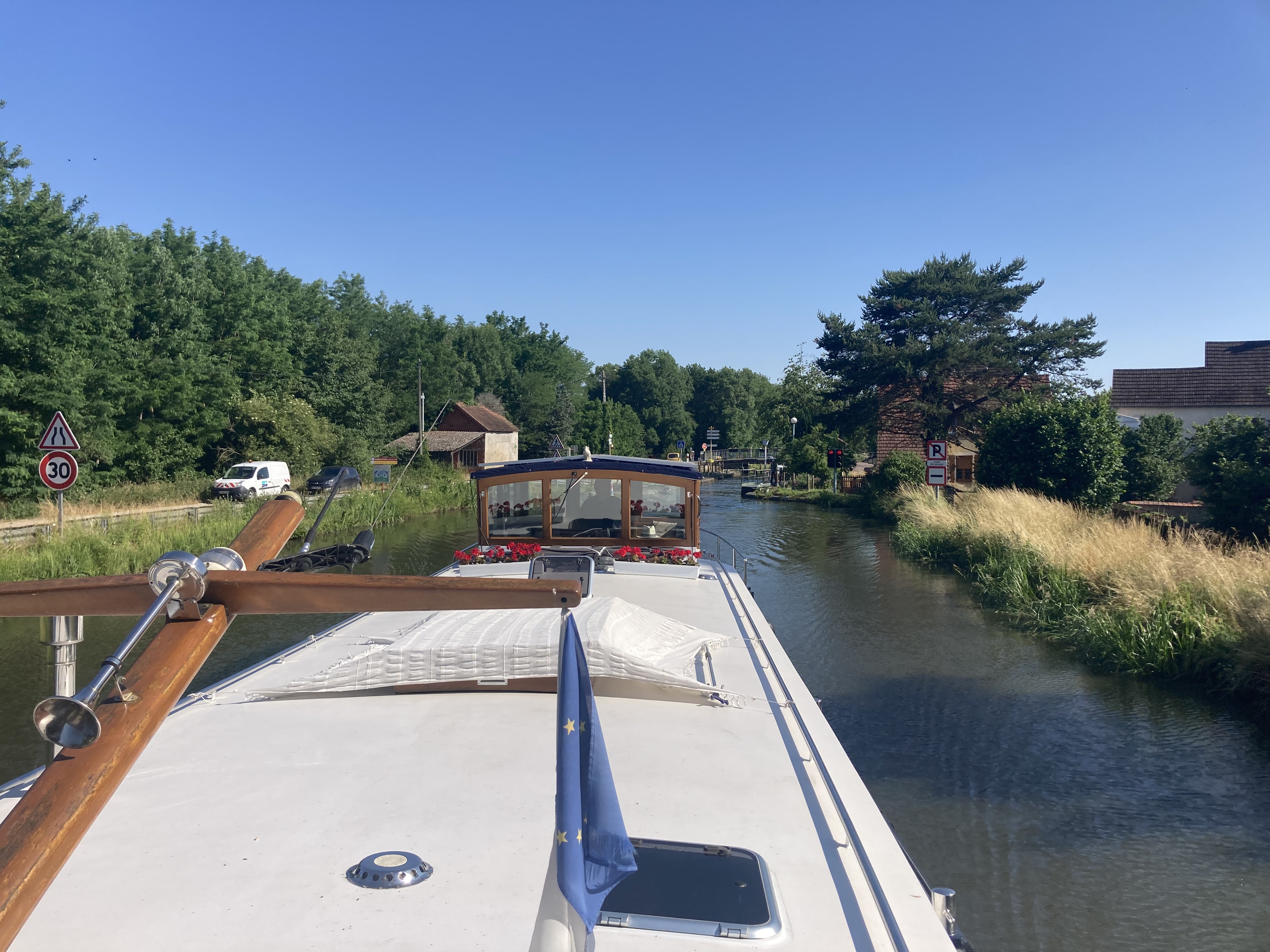 There were several interesting navigational challenges for the Captain today. The long straight run into Chagny is a popular place for live-abaord barges, making then navigable channel narrower than normal. The friendly Irish crew of a barge at the other end waited for us to come through.