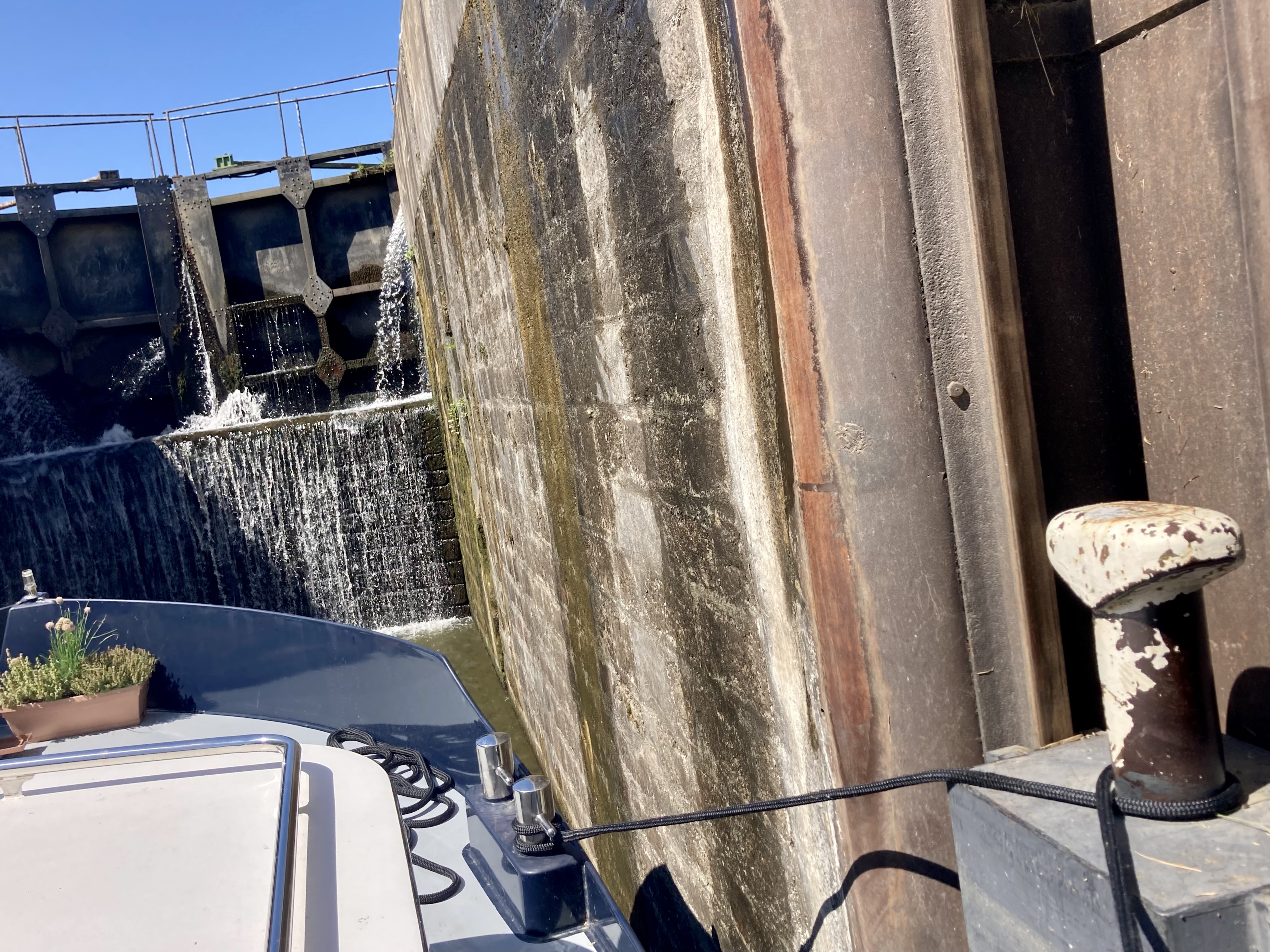 The first lock, another of the deep ones for this canal, would of course have the usual two floating/ rising bollards – except it didn’t! One was missing.