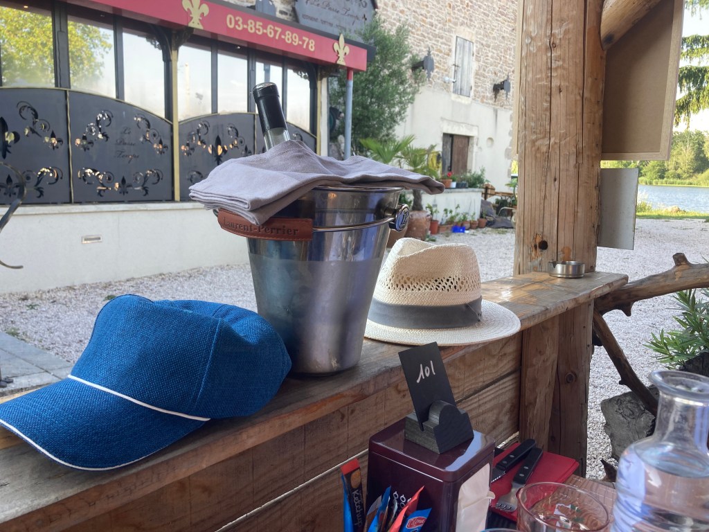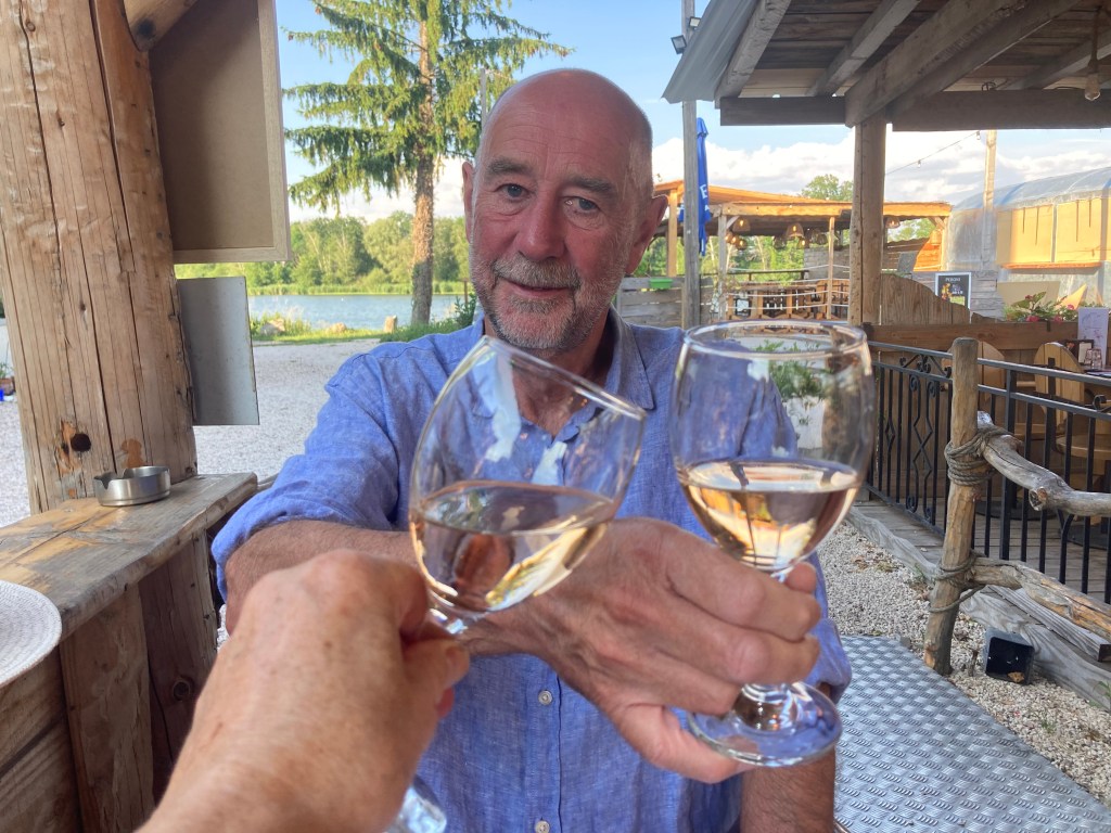 The summit celebration – wine, pizza and salad next to an étang. It might seem I am over-egging it, but it was a cause for celebration that my recently broken ankle had stood up to everything required of it on the boat, and Captain could once more have confidence in the fitness of his crew.