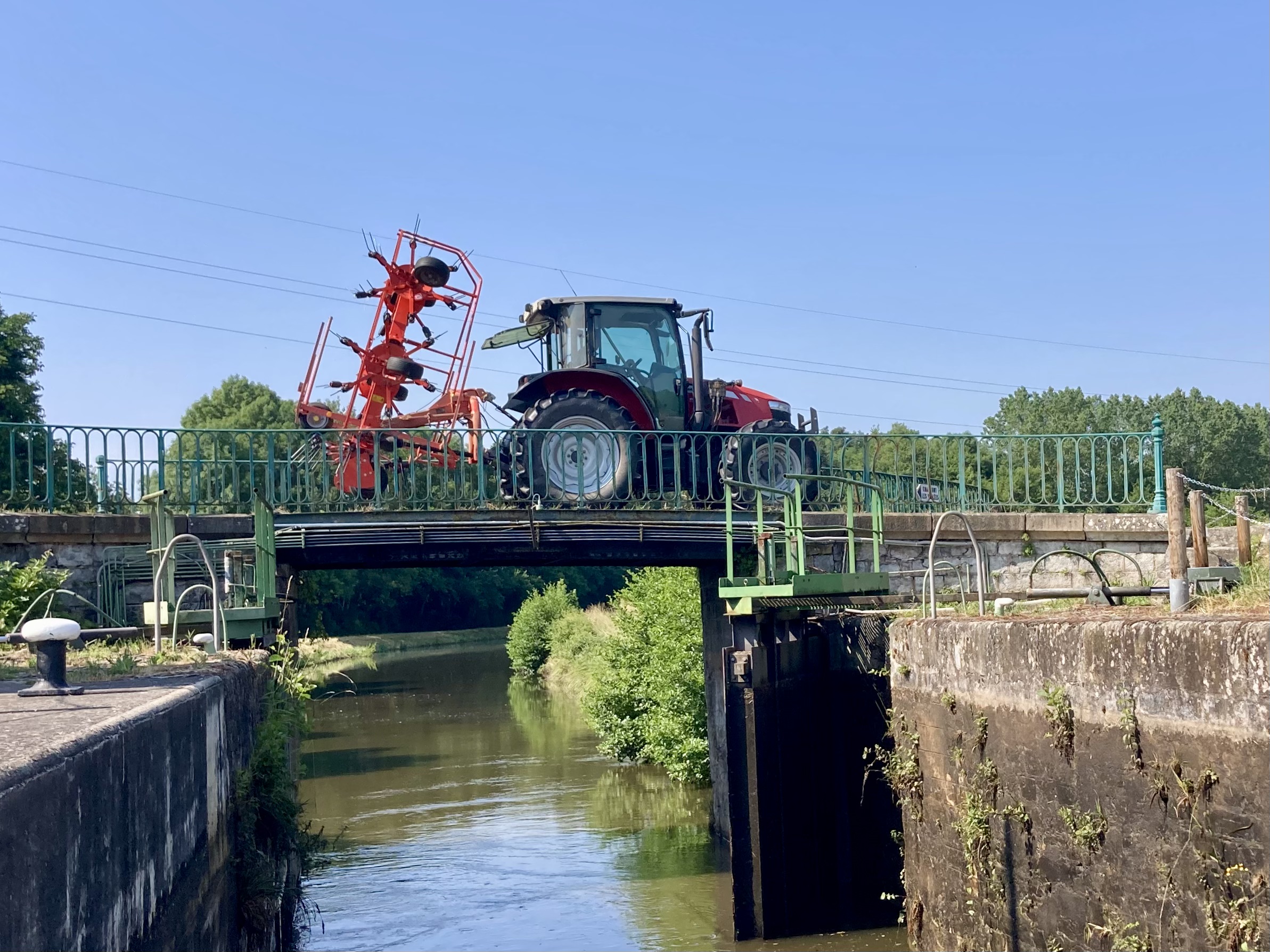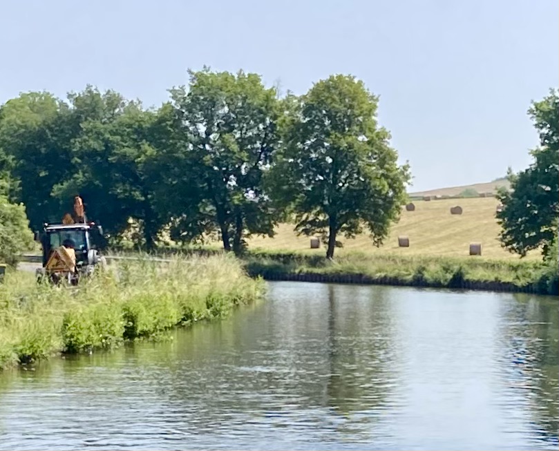 It was obvioul;sy a busy time on the local farmers with tractors alongside us and over us all the way along the canal that day. We enjoy seeing the seasonal aspects of life in the countryside, whilst knowing that it is hard work and long days in mid summer.