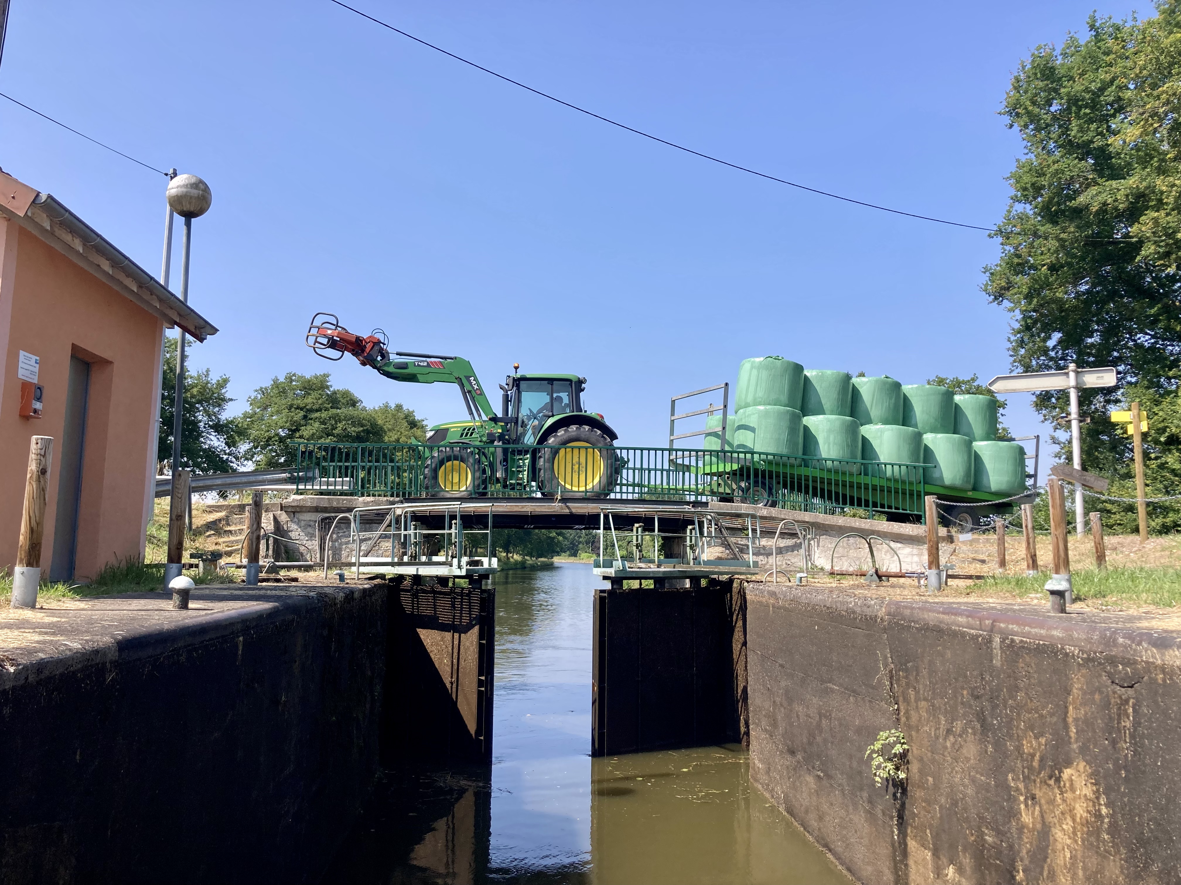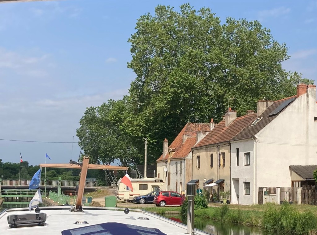 Leaving Montceau meant going under the three post levées (lift bridges) of the town. We called ahead and right on cue the first, bridge rose, followed by the second and third as we made our way along the canal. The time lapse video shows what it is like – three blue bridges, all lifting in different ways; good modern engineering.