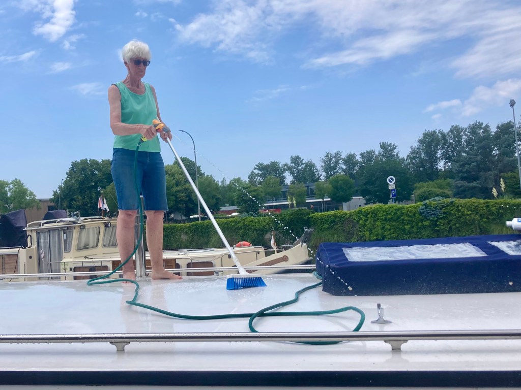 Sunday was a dedicated boat cleaning day. I had not had the wherewithal to get up on Stewart’s beautifully repainted white cabin roof since breaking my ankle, but felt ready for the challenge. It was worth it.