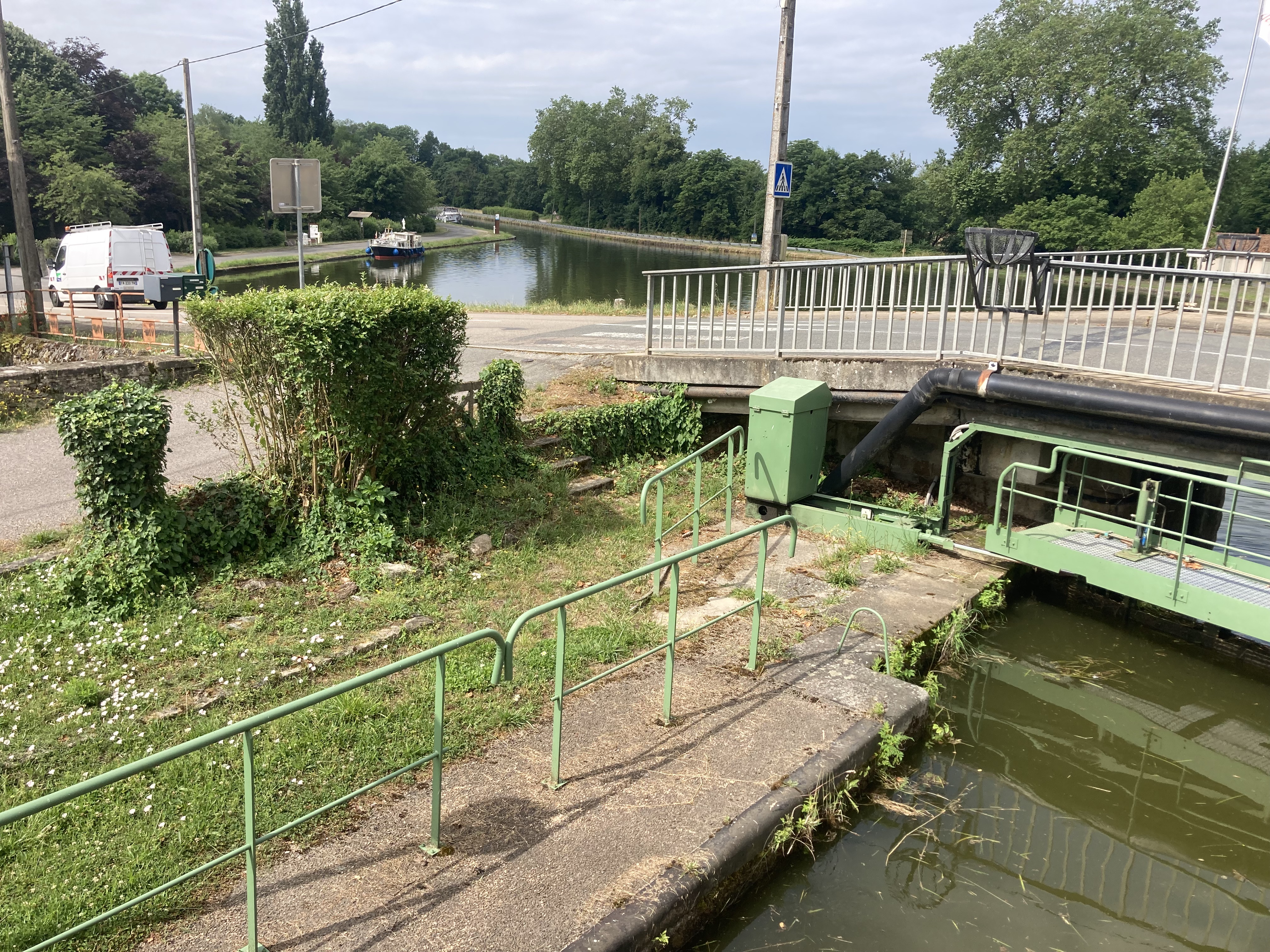 In this case it was the lock at Montceau and we tied up to some nice blue railings, had lunch and waited to cover the last few hundred yards of our journey.
