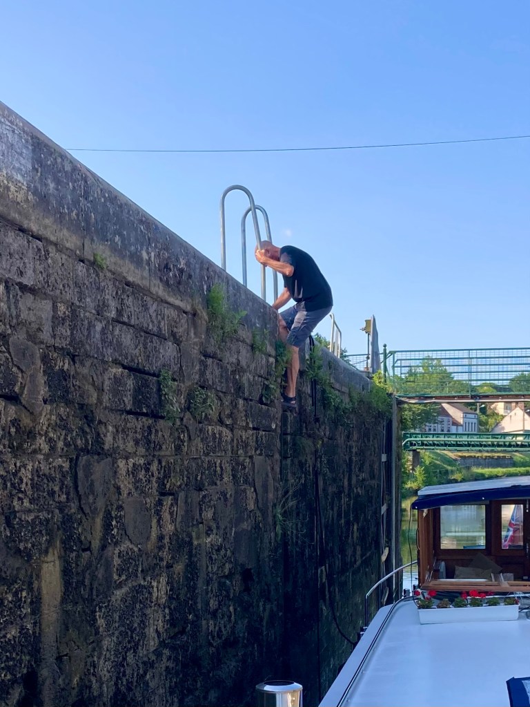 The ladder was Captain’s end of the boat so he got to climb up this time.