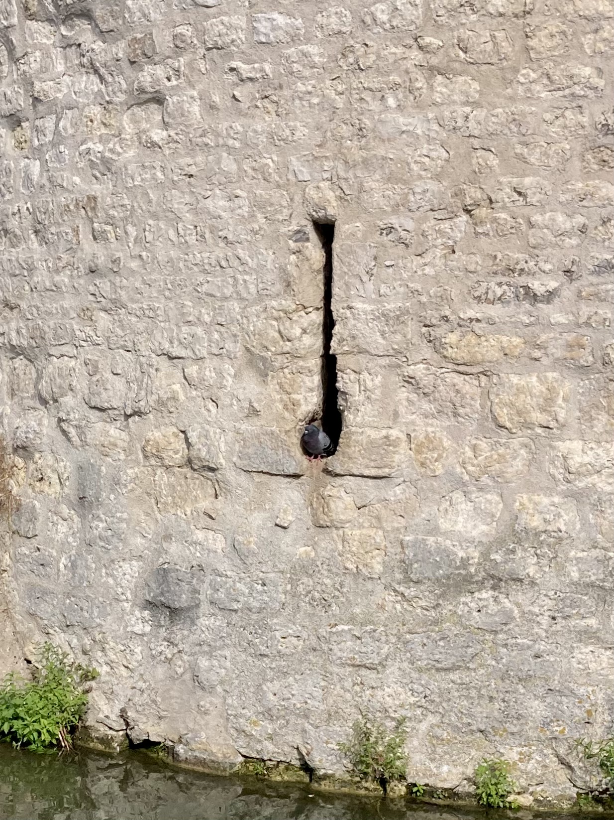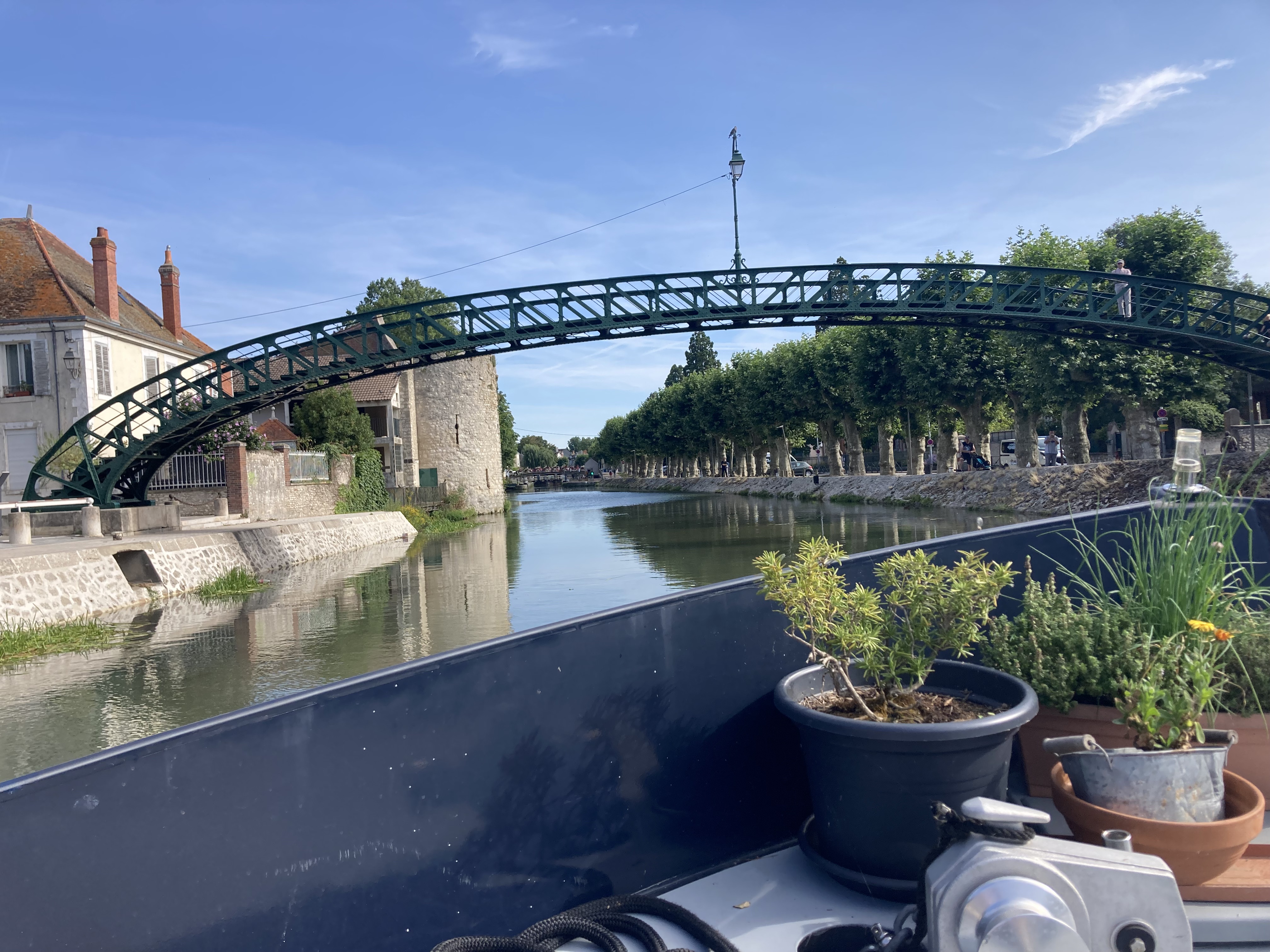 We began at Montargis, where the Canal de Briare ends, and dovetails into Canal de Loing. We had spent a couple of fascinating days in Montargis – a place well worth a visit, and described in the previous blog post. Leaving town gave us a few new angles on bridges, waterways, and the old tower with its pigeon on guard in the arrow slit.