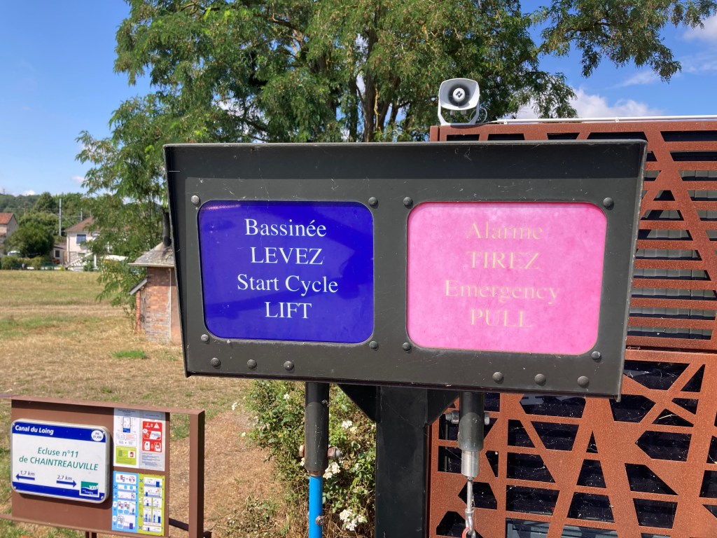 Once in the lock we head for the long blue and red ‘poles’ that hang down from this sign, tie up and lift the blue pole ……. being careful not to pull the red pole in error as that signals an emergency.