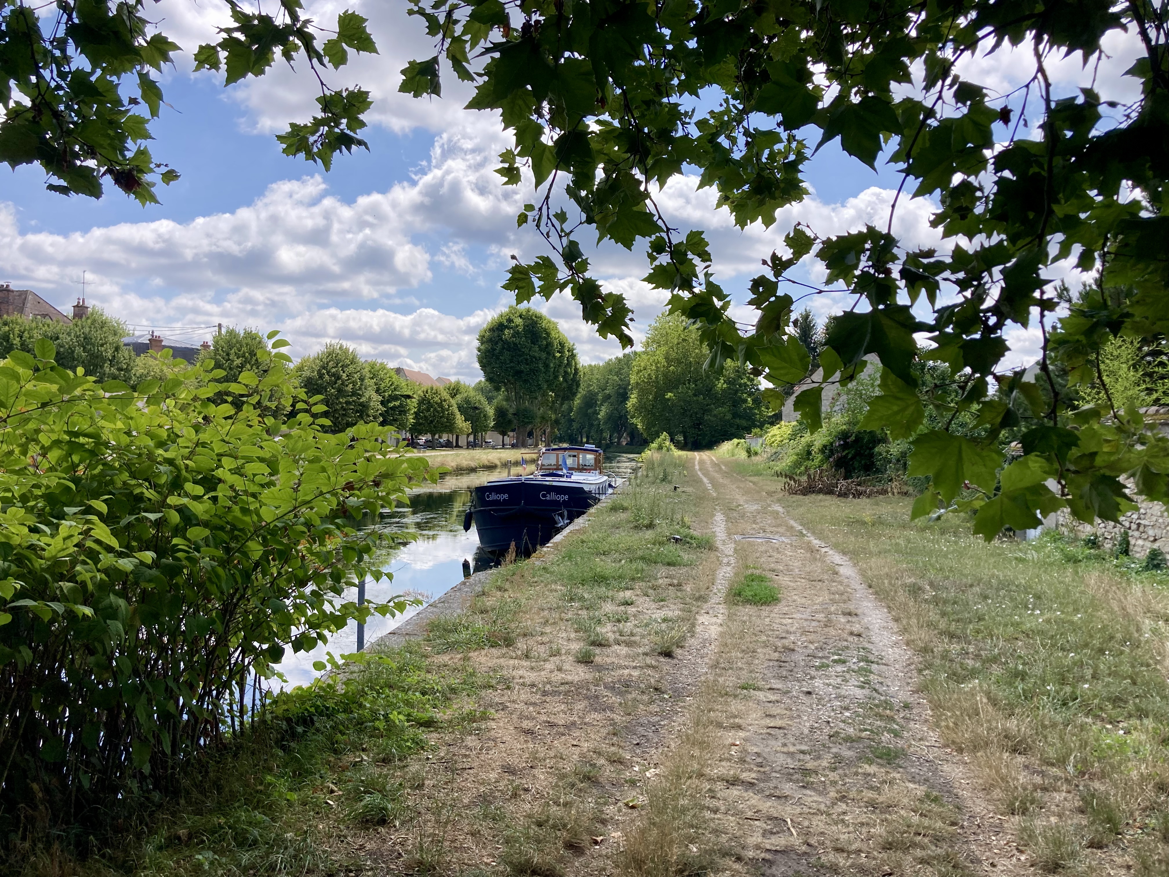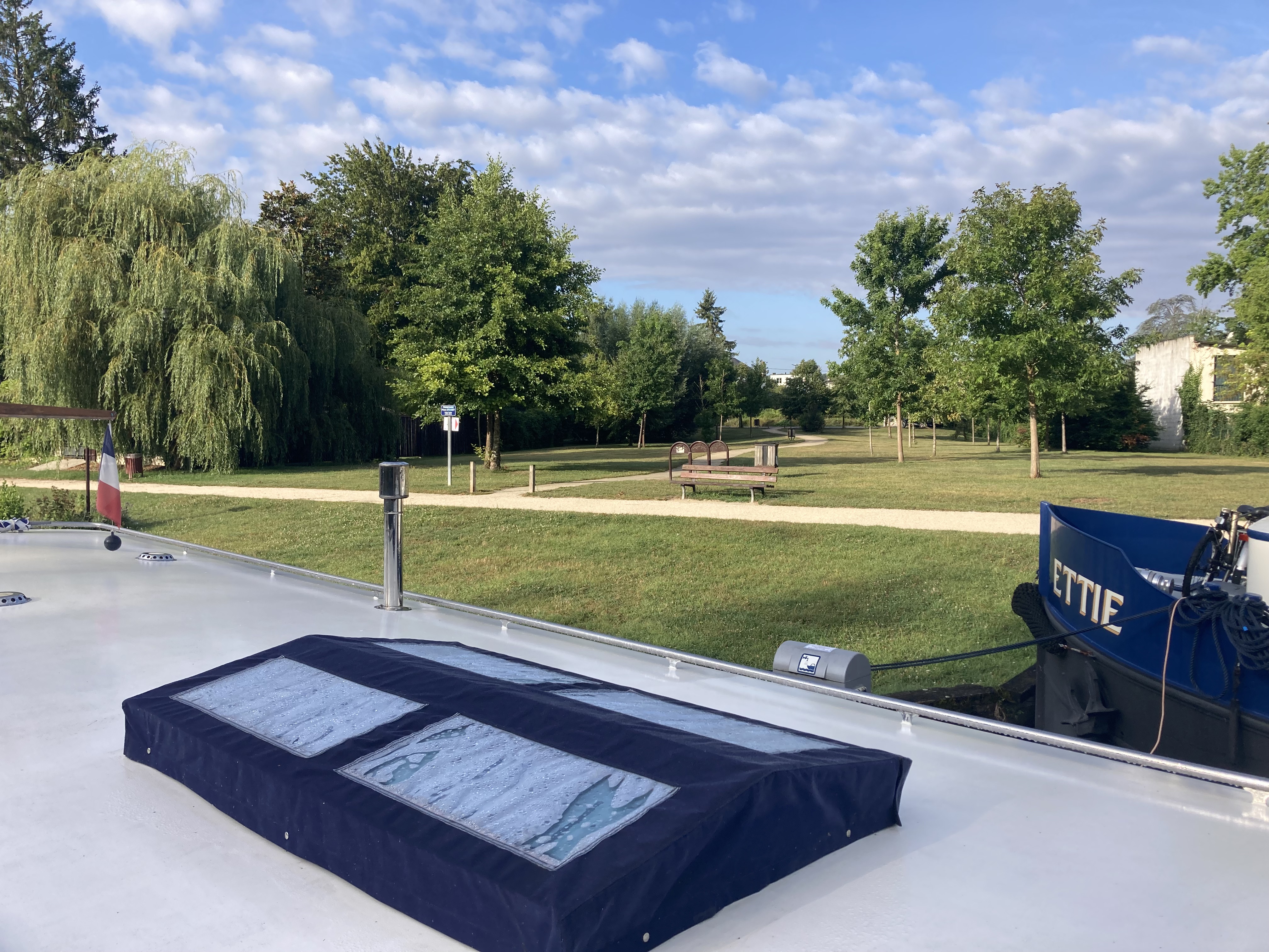 The day of our departure both from Moret and from the Canal / River Loing came in blue. The park next to the mooring was quiet and green. All was set fair for Calliope and crew.