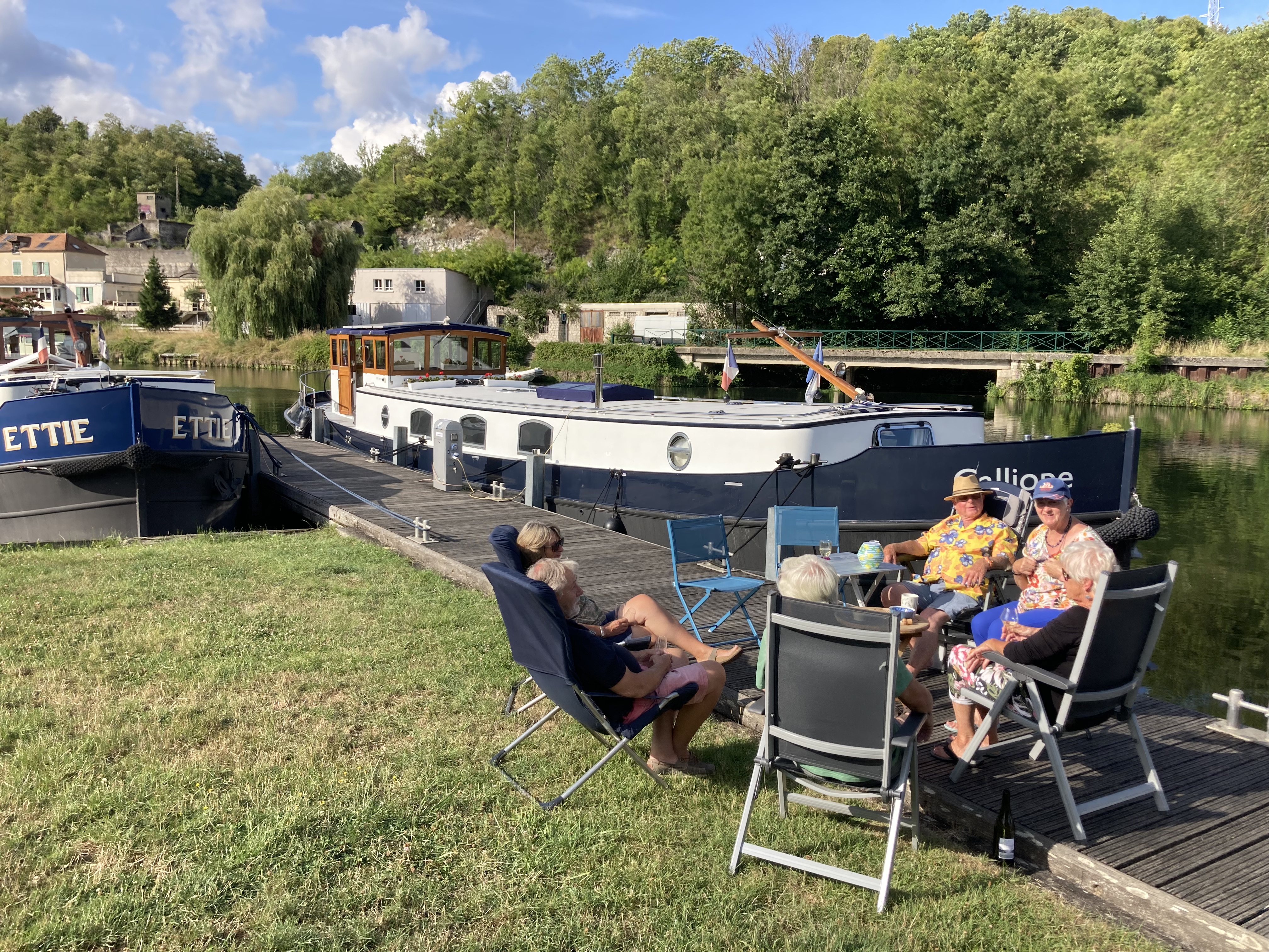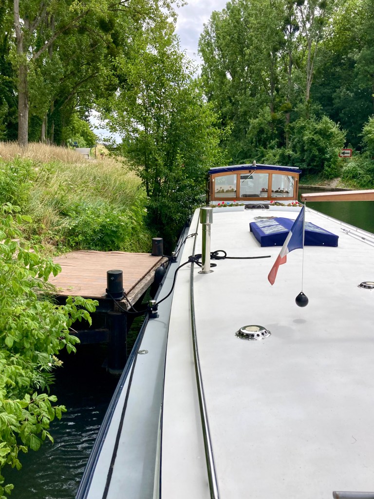 The pontoon layout at Moret is different – three pontoons at a very small angle to the river bank. It is hard to explain and show, but here we are on the outside of pontoon 1, and sister ship Ettie arrived later to moor on the inside.