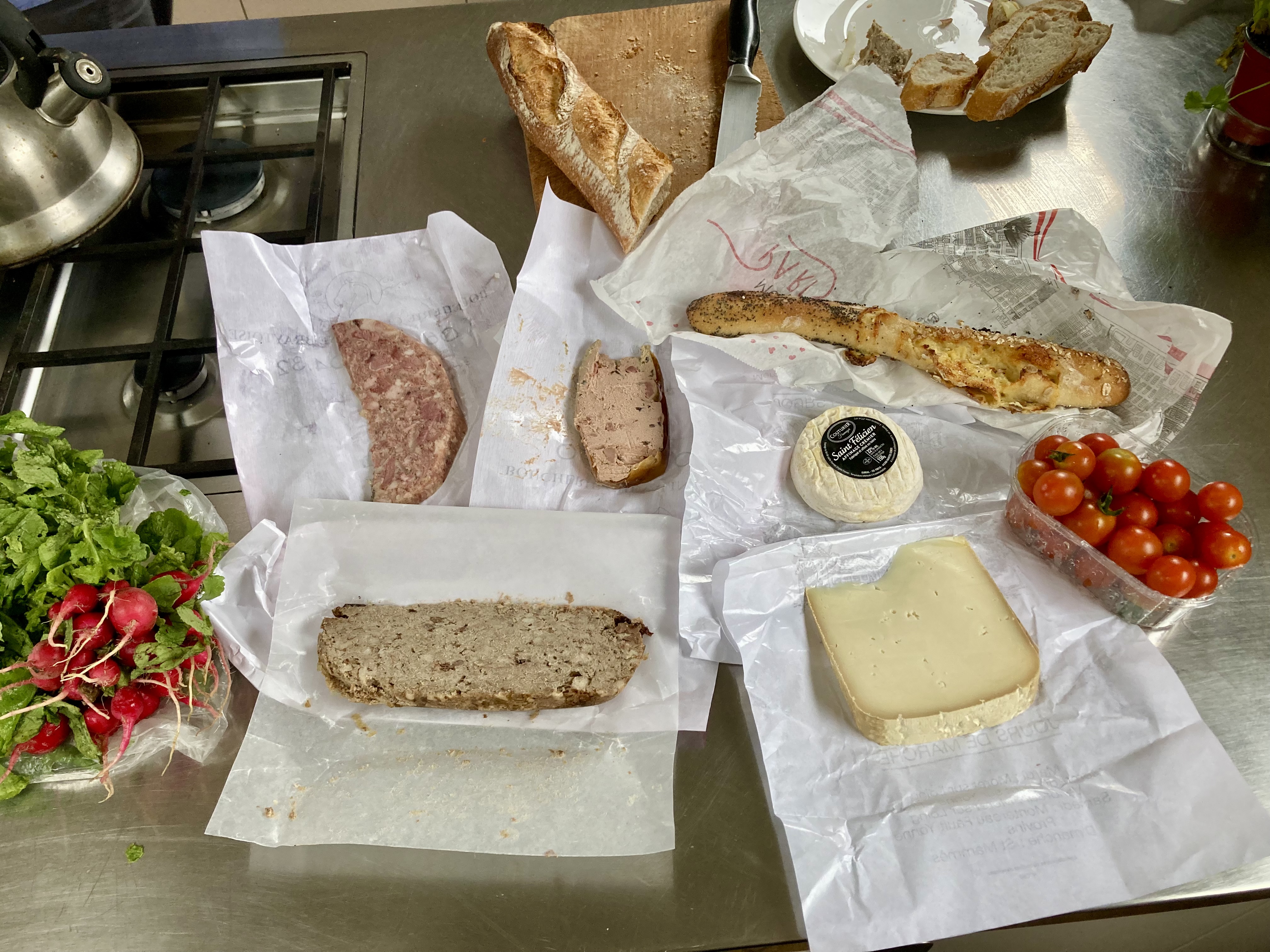 For those who are wondering, the cheeses are Stu’s favourite Saint Félicien, and my favourite Brebis et Chèvre (sheep and goat). The patés are a local Moret rough textured paté, forestière, and paté de tête. You can also see a good gruyère fougasse, fresh tomatoes and radishes, and a crusty baguette. Yum yum.