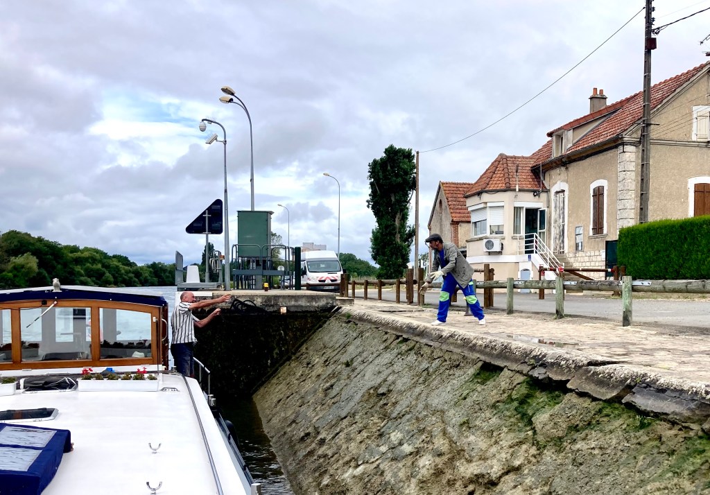 It would take a mightier crew than me to throw ropes onto bollards in these locks, but luckily that is expectyed and the éclusiers (lock keepers) emerge to help us moor up. I only have to throw my rope to land at his/her feet.