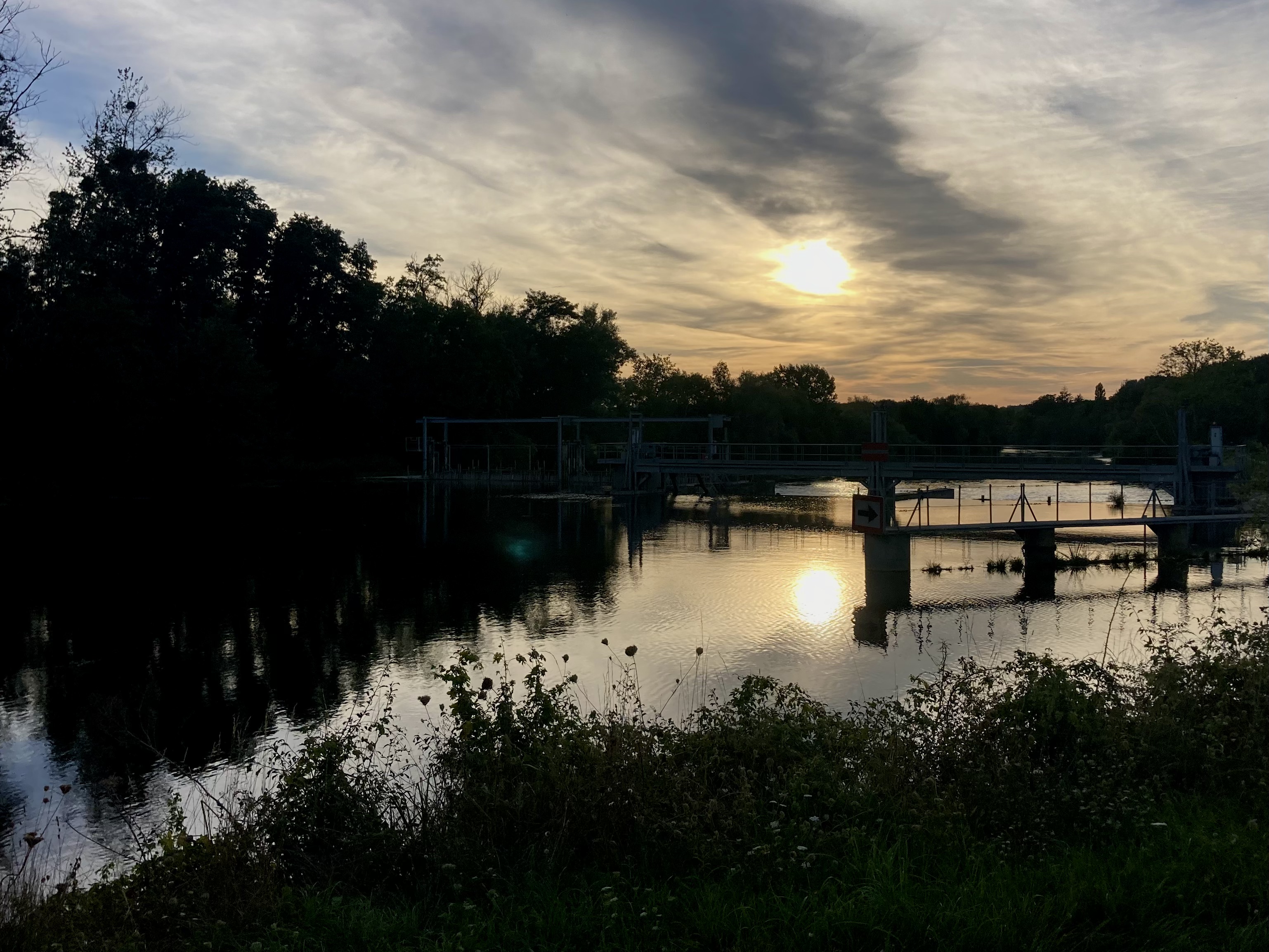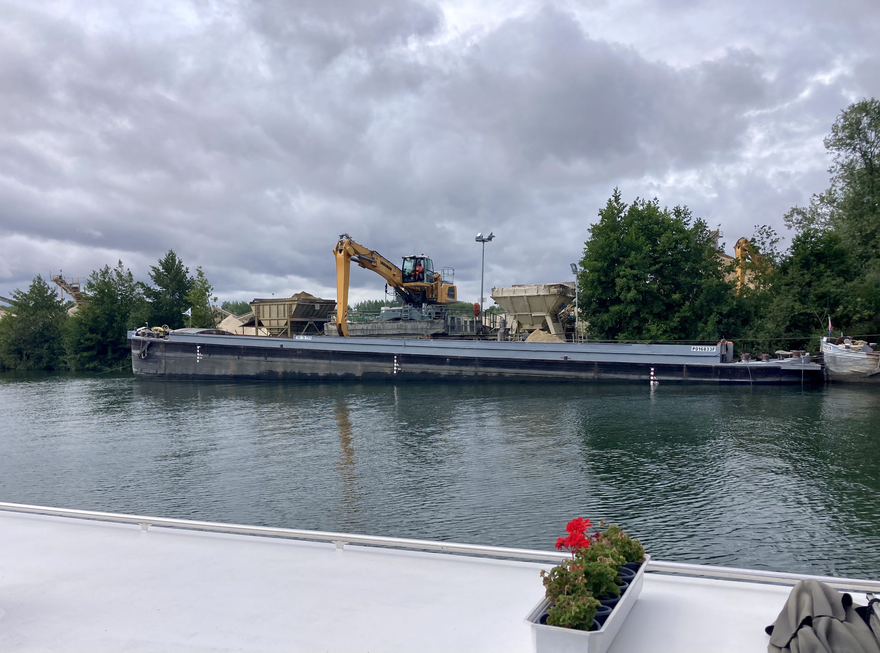 Along the way towards Port Renaud we had constantly changing views, from the heavy industrial gravel loading sites to some incredibly green (overgrown!) weirs and the intense yellow of sunflower fields – with apologies for the orange netting.