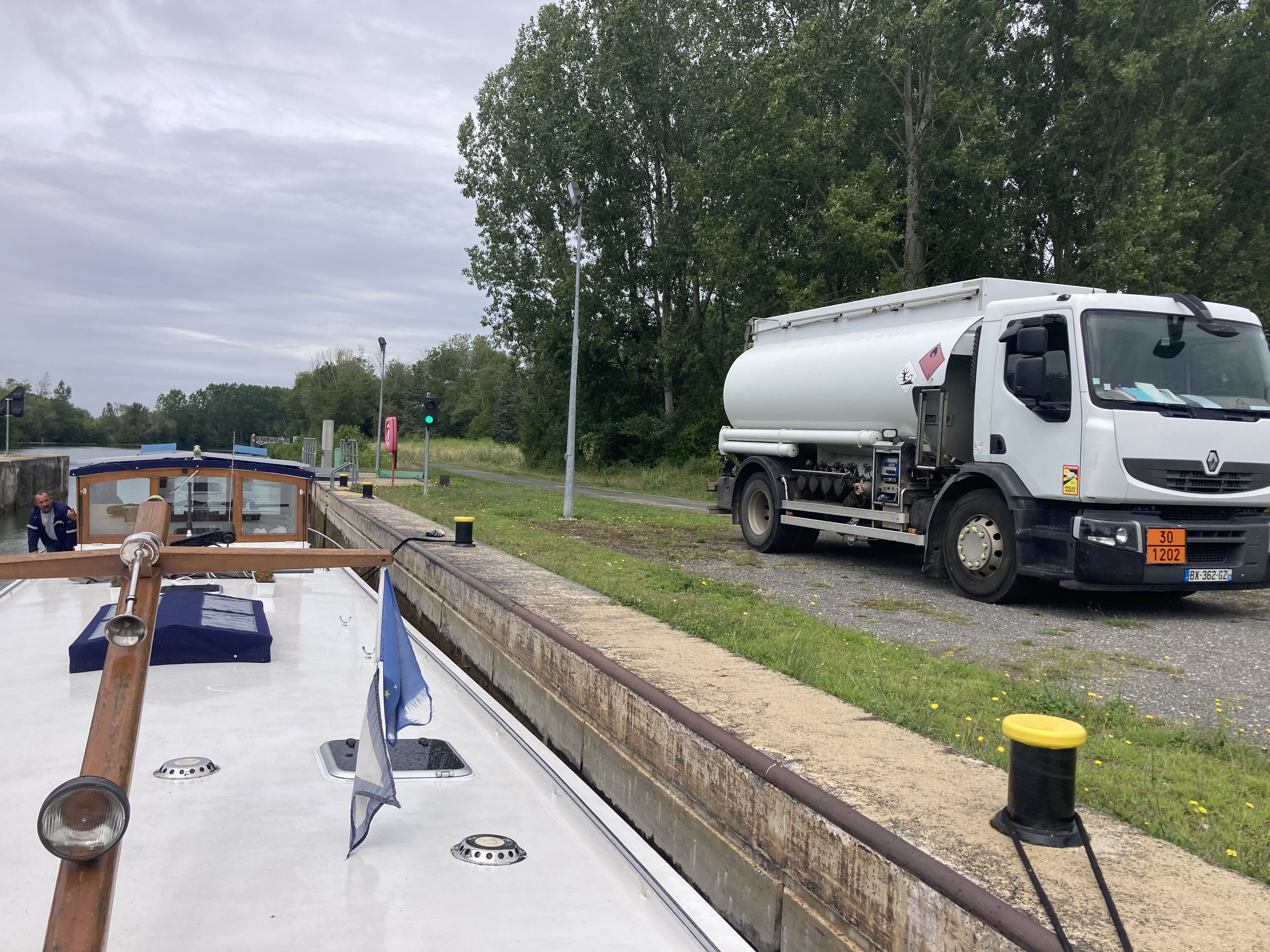 After a delightful weekend’s sojourn in the country our fuel tanked arrived and a very friendly helpful tanker driver (just visible by the wheelhouse) was soon on board filling us up with 800 litres of white diesel at a good price!