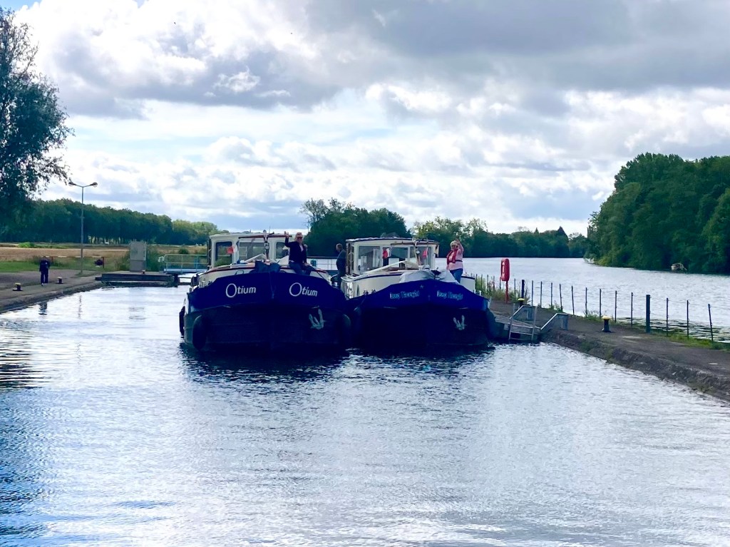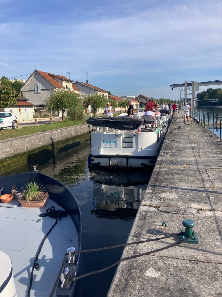 This was at the écluse at Cuy., where the sloping side lock had one platform to help boats go up or down. So being friends they rafted together to the platform and negotiated the lock ‘ensemble’.