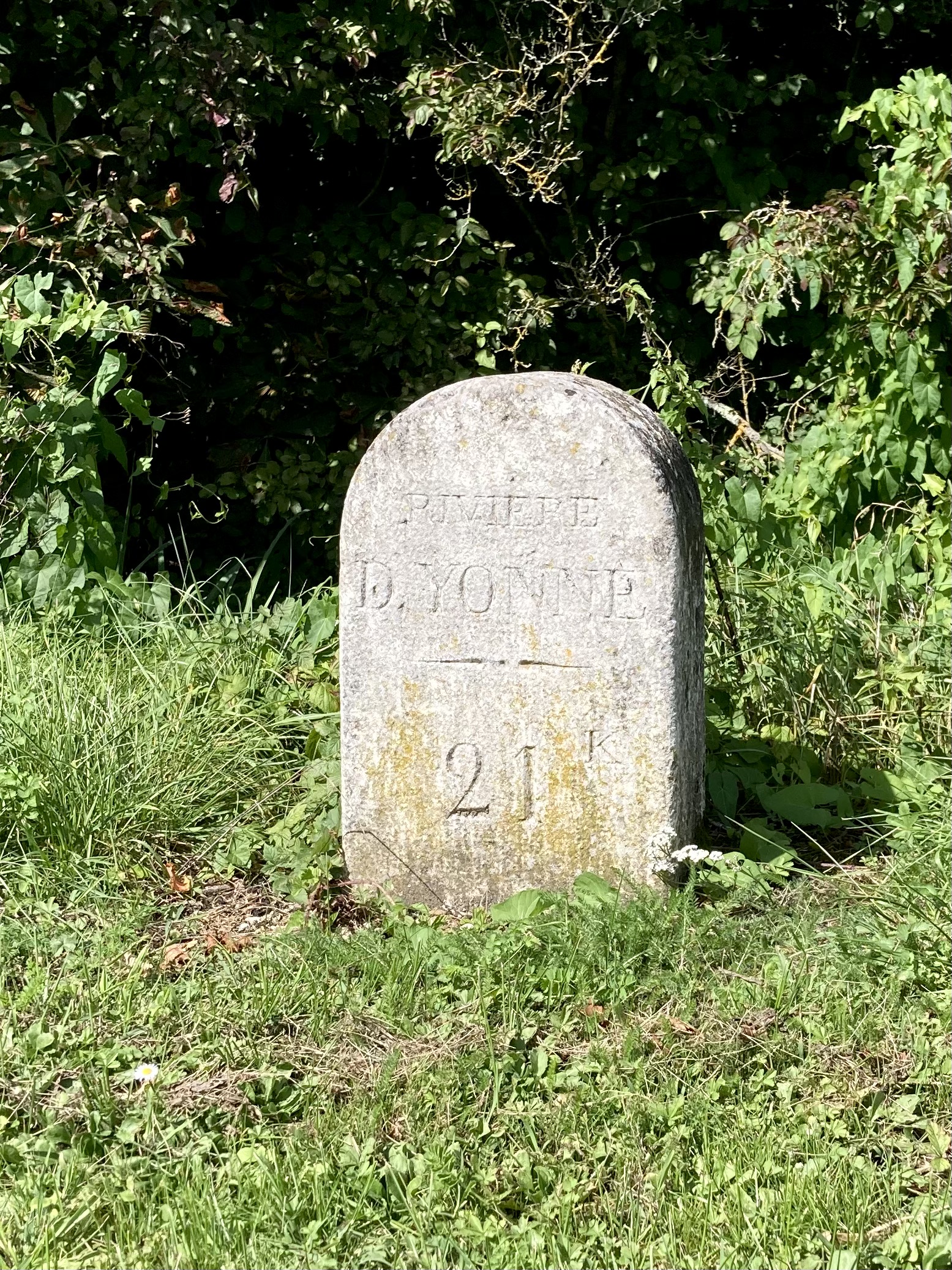 It’s strange how the same stretch of river, or canal, can look different when you are going in the opposite direction. So it was that I noticed the lovely stone steps up to some of the bridges and locks, the later clover growing alongside, and the beautiful old kilometre markers, like milestones. This one was telling us that we were on the Riviere D (de) Yonne and 21 kilometres from Auxerre.