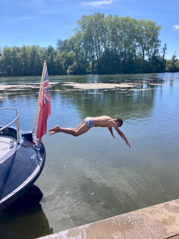 Arriving at the pontoon we found ourselves disturbing some young lads having fun swimming in the river. And who could blame them on that hot day?