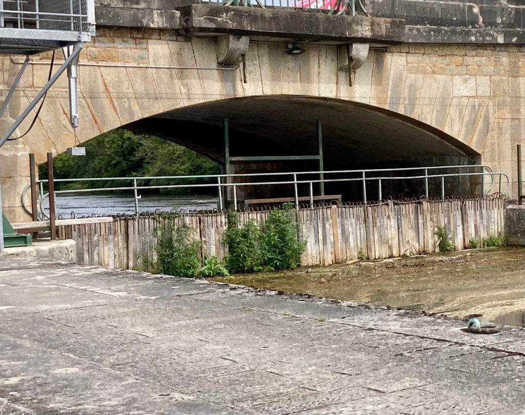 The weir is still partly a wooden aiguilles (needle) weir. To change the water flow the waterways men (and women) have to walk along the weir adding or subtracting the wooden ‘needles’.