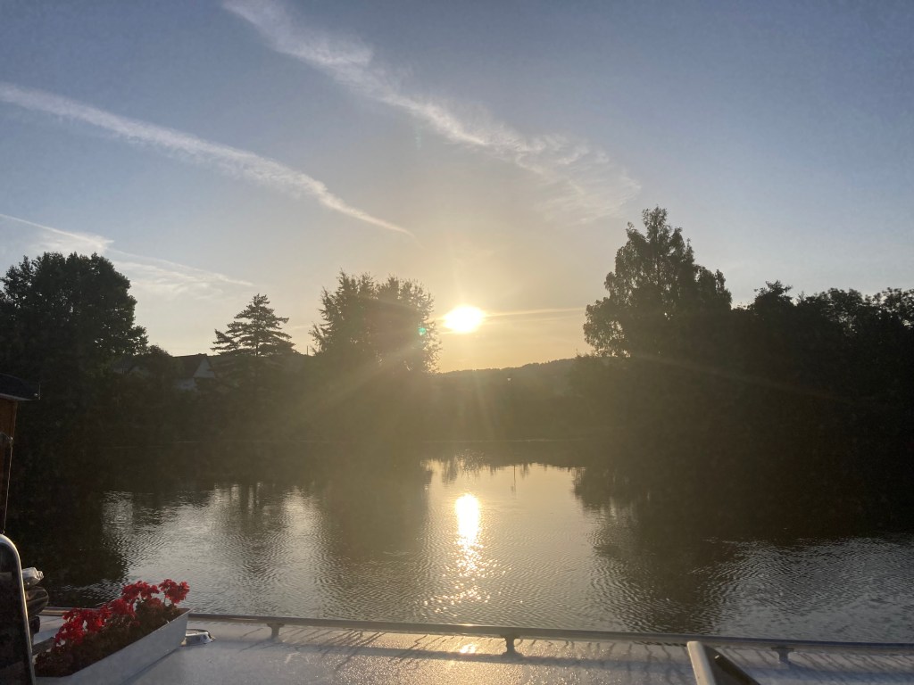 At 9pm it was still light, and just the start of an evening’s rosy sky. A hotel barge had come in behind us, waiting for its guests to arrive by luxury minibus at some point.
