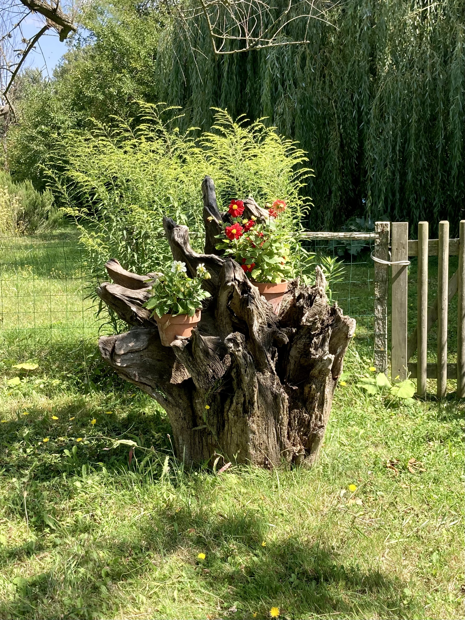 Lunch and lavoirs over we were back into cruising mode. As so often happens, it was the locks that provided interesting things to photograph. One is yet another ‘desirable’ deserted lock keepers cottage; so many of them along the canals. And at another, where the lock keeper is still in situ, a delightful use of a tree stump to hold pots of flowers.